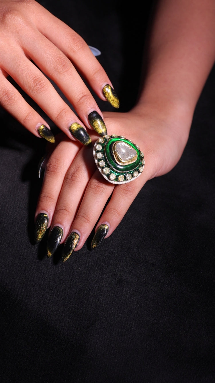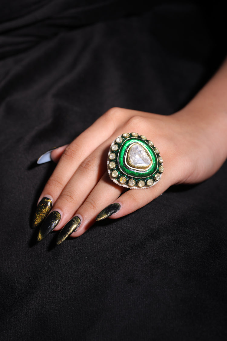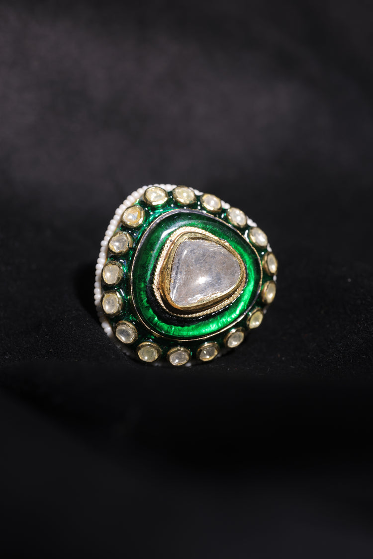 Crafted in 18-carat gold, the Emerald Radiance Polki Ring features a triangular uncut Polki diamond at its center, set in a gold bezel and framed with vibrant green enamel. The design is beautifully finished with a delicate border of closely set white pearls that add contrast and refinement.