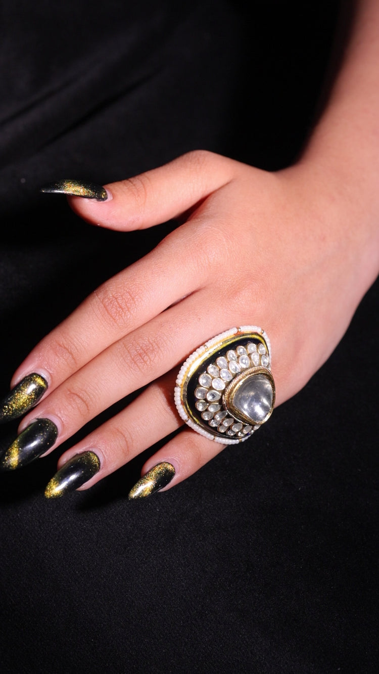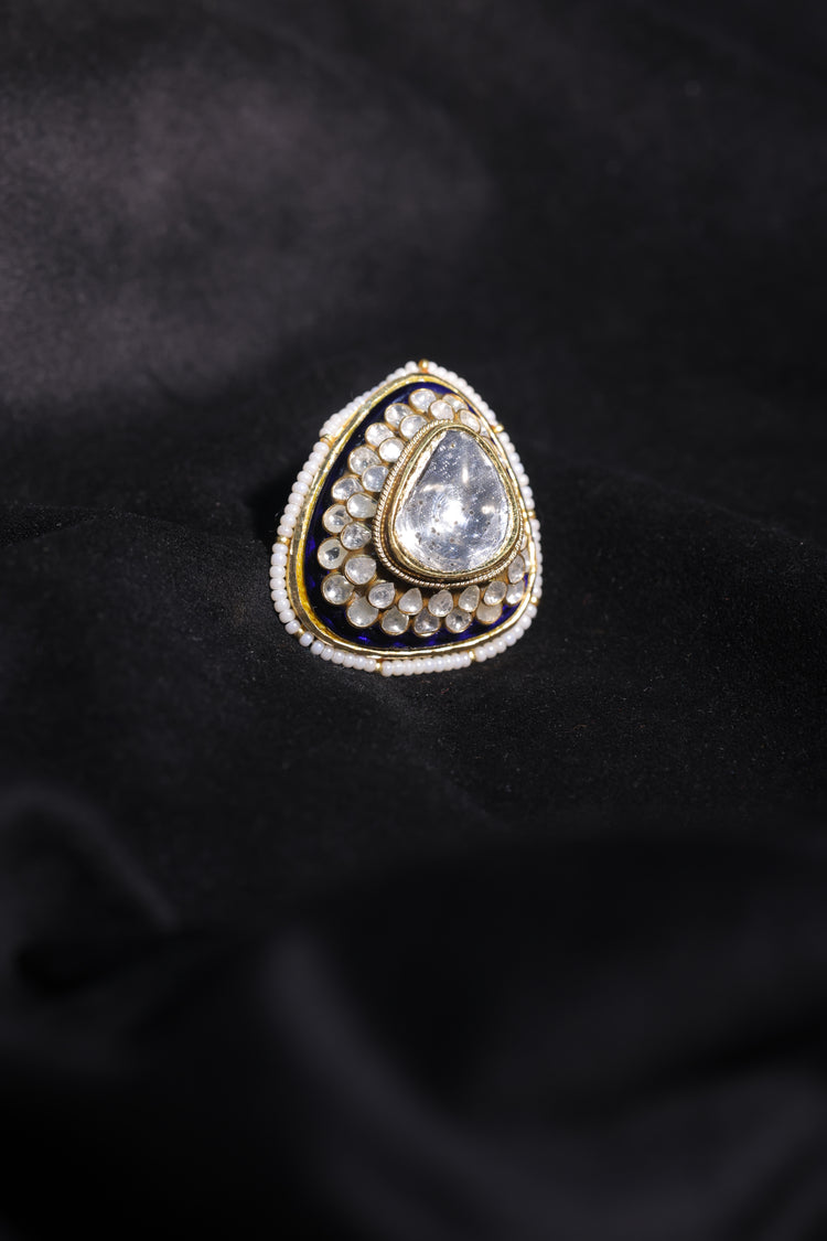 Crafted in 18-carat gold, the Trinity Shine Ring showcases a striking triangular design centered with a large clear Kundan stone, encircled by sparkling crystals. The piece is framed with rich green enamel and outlined with fine white pearls, adding a graceful, intricate finish.