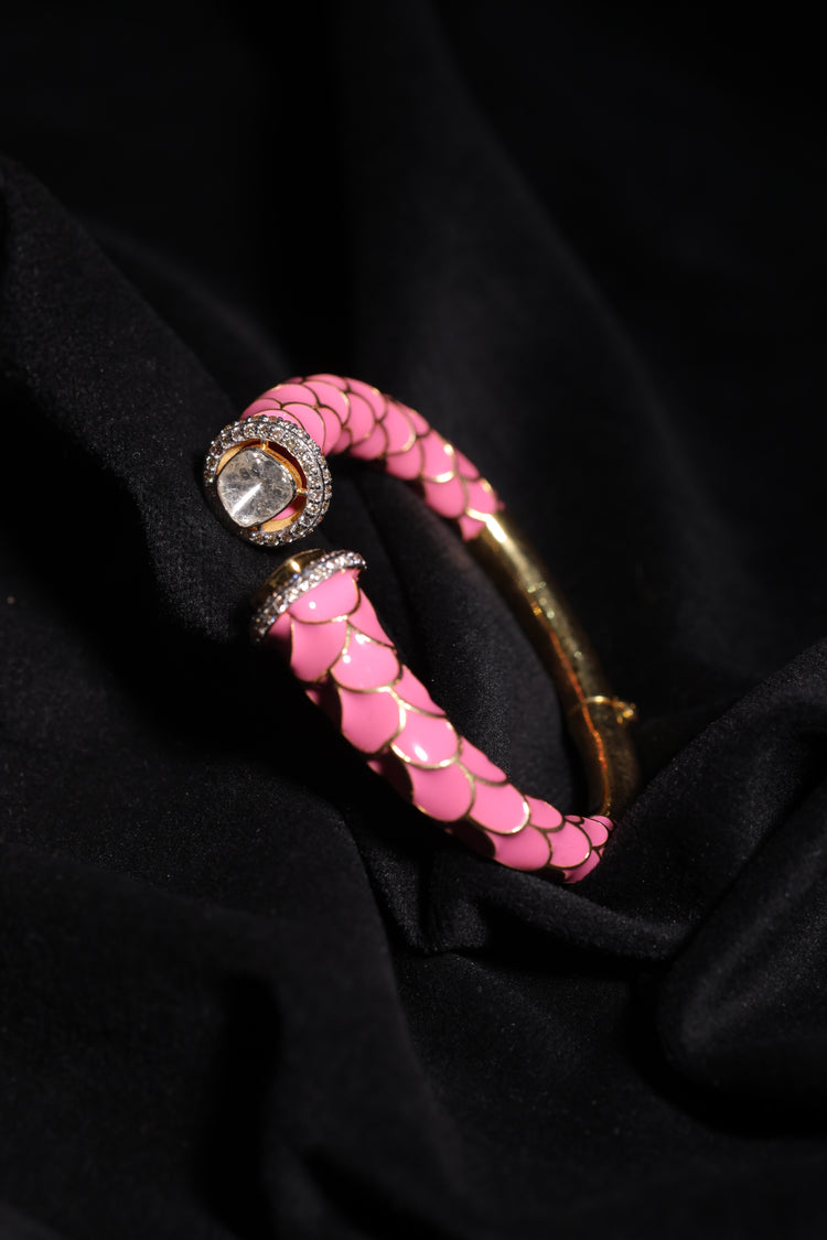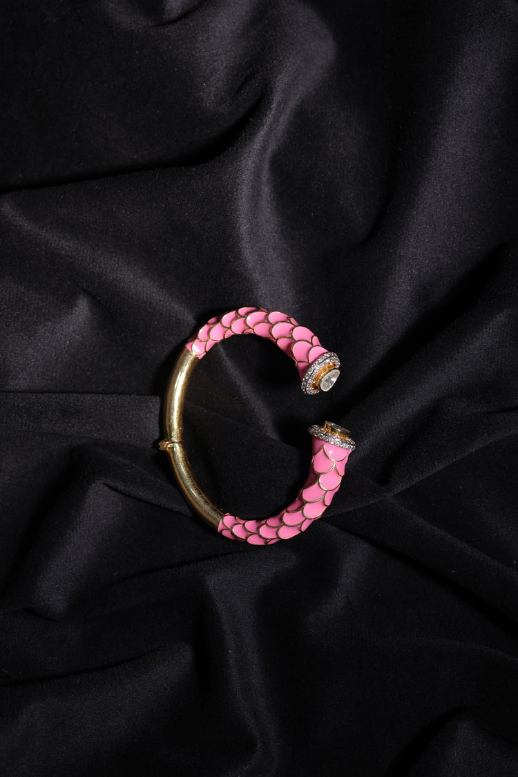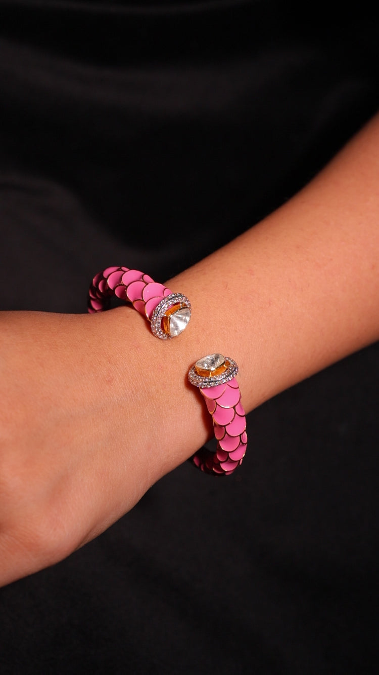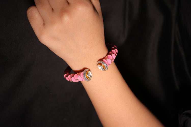 Crafted in 14K gold, the Coral Bloom Bracelet features a unique open "C" shape design. Its outer surface showcases a vibrant pink scale-like pattern, contrasted by a smooth gold finish on the inner side. Each end of the cuff is embellished with a cluster of clear stones encircling a prominent orange gemstone, creating a striking and luxurious focal point. This contemporary design balances color and elegance, making it a standout accessory for any ensemble.