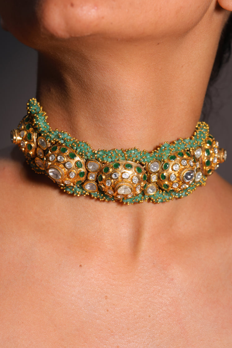 Expertly crafted in 18K gold, the Emerald Dome Polki Hathphool Bracelet blends regal tradition with versatile elegance. This piece features a series of dome-shaped elements, intricately connected to wrap around the hand in a style characteristic of a traditional Hathphool. Each dome is embellished with uncut Polki diamonds, surrounded by green enamel Meenakari work and accented with small green beads. Designed with an adjustable chain for comfort, this bracelet can also be worn as a necklace, offering dual functionality.