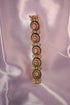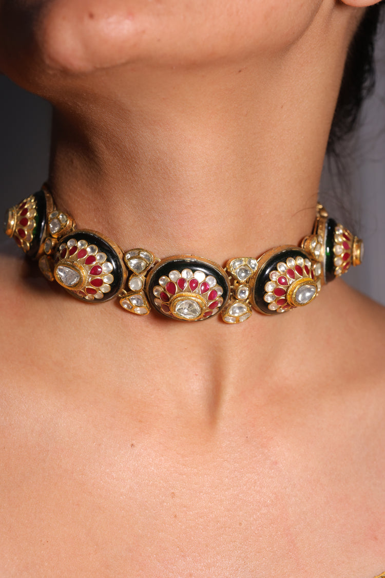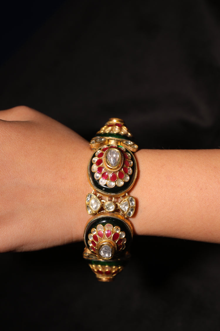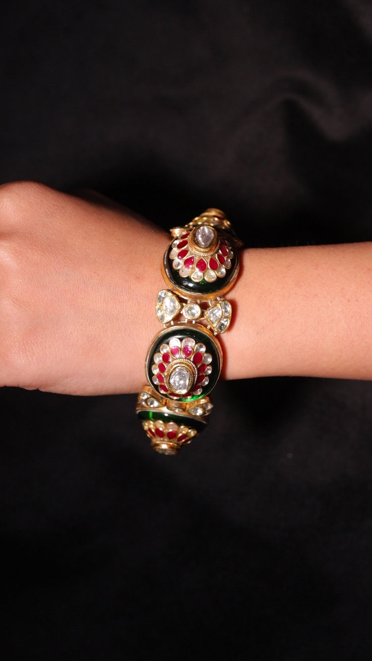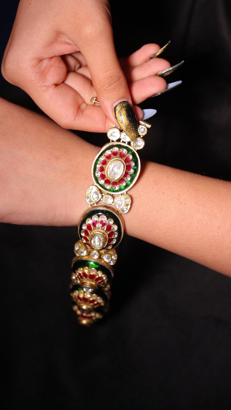 Crafted in 18K gold, the Regal Trio Convertible Bracelet embodies the elegance of traditional Indian jewelry. This versatile piece features three prominent circular settings, each showcasing a central clear gemstone surrounded by a halo of rubies, pearls, and uncut Polki diamonds. Intricate enamel detailing enriches the gold base, adding depth and color to the design. The bracelet is equipped with a hinged or screw mechanism for ease of wear and can also be worn as a necklace, enhancing its multifunctional appeal.