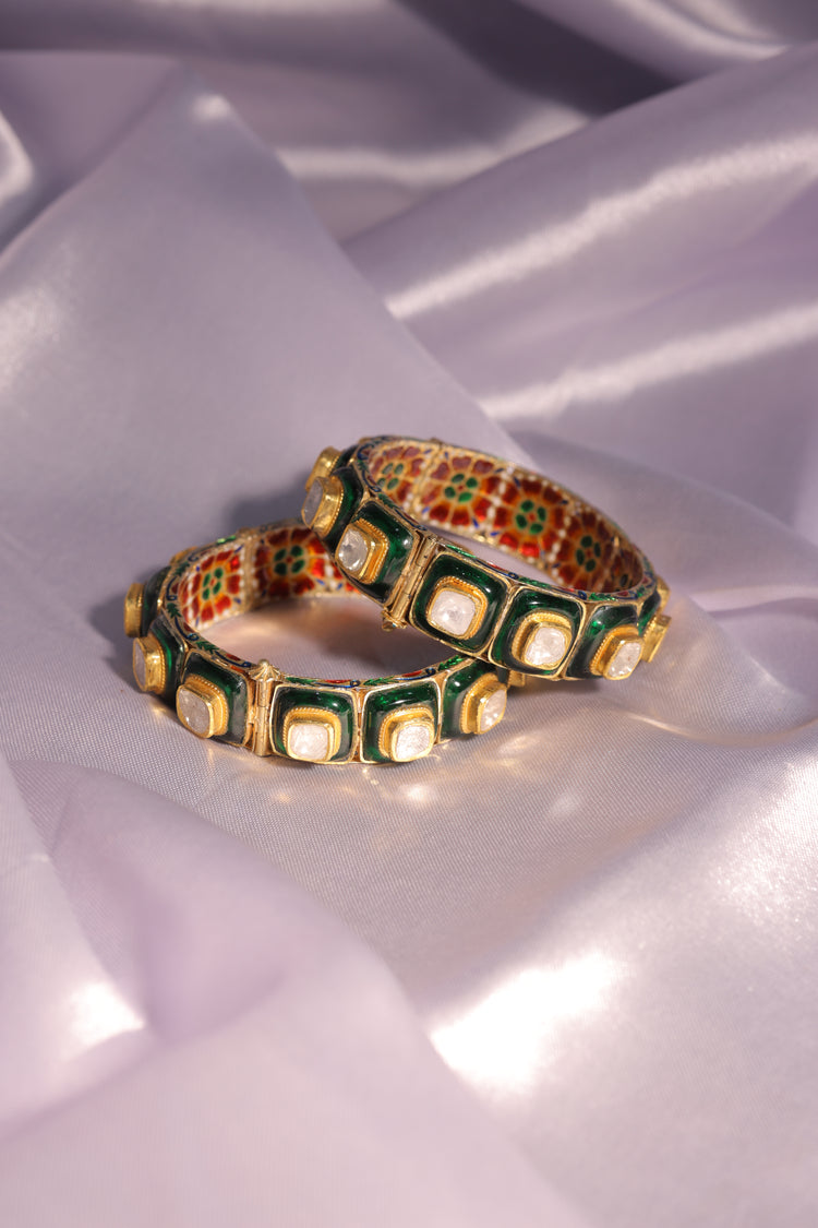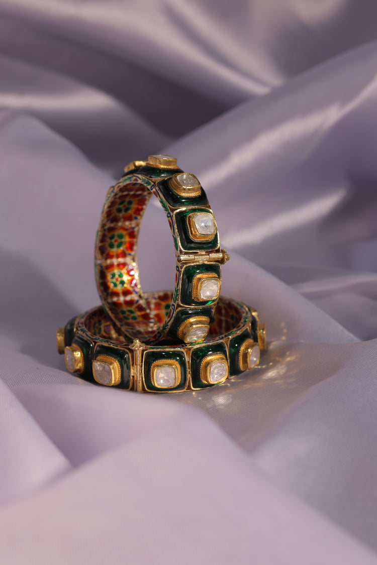 Crafted in 18K gold, the Royale Green Bangle Set features square-shaped traditional Polki style. The dark green enamel work around the stones enhances the gold-toned metal, creating a striking contrast. These chunky bangles exude a regal presence, perfect for adding a bold touch to your ensemble.