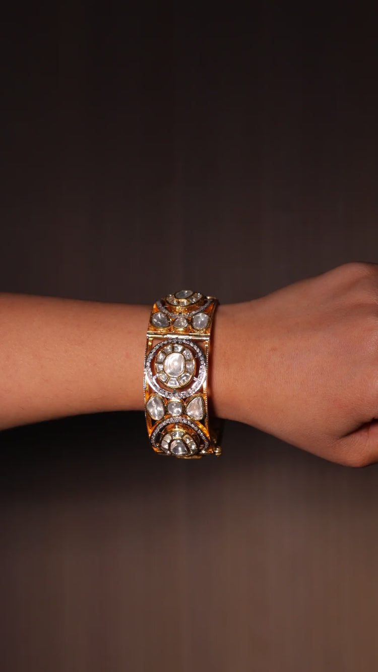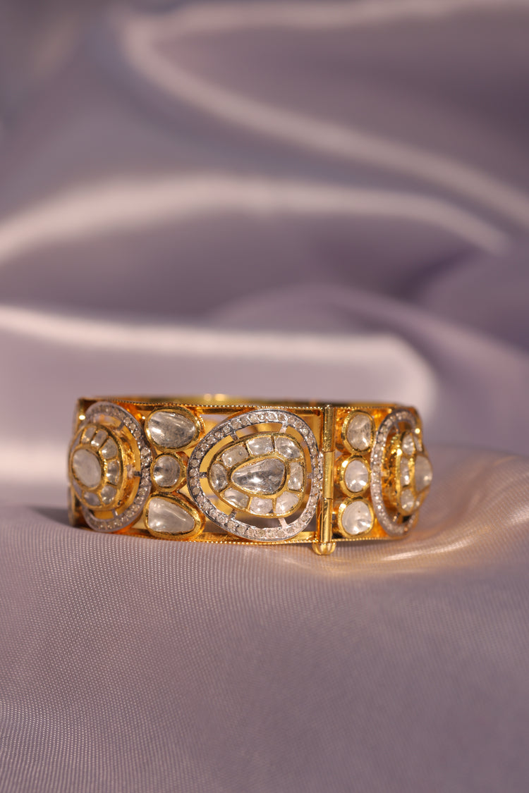 Crafted in 14K gold, the Polki Elegance Hinged Bangle features a series of uncut Polki diamonds set in an intricate pattern. Oval and round shapes, encrusted with Polki diamonds, are surrounded by smaller diamonds and delicate gold detailing, enhancing the piece's rustic charm and sparkle. The hinged closure ensures a secure and easy fit for everyday wear.