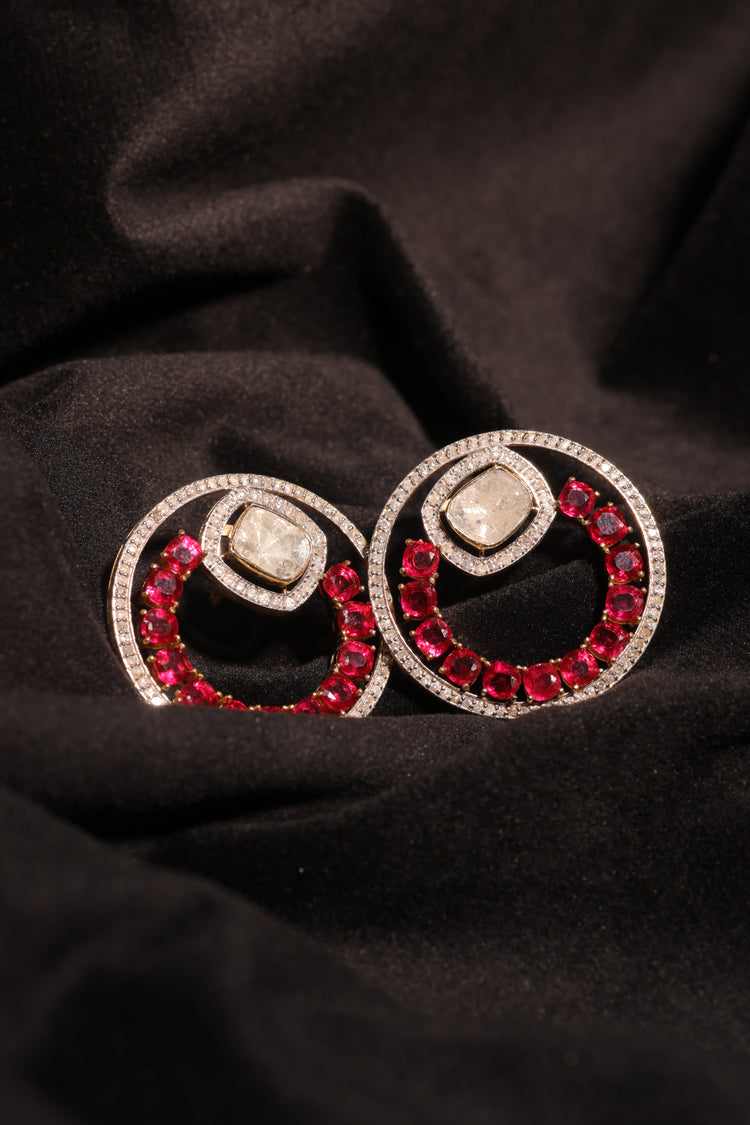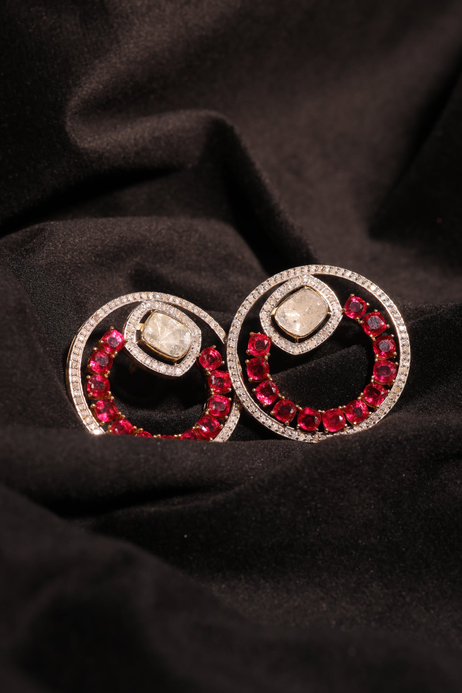 These Diamond On Diamond Circular Earrings are an elegant blend of geometry and brilliance. Each earring features a central circular design that houses a prominent square or rectangular-cut stone, adding a bold focal point. The lower half of the circle is adorned with vibrant red gemstones, likely rubies, that create a striking contrast. The outer rim is lined with smaller clear stones, enhancing the sparkle and lending a luxurious finish.