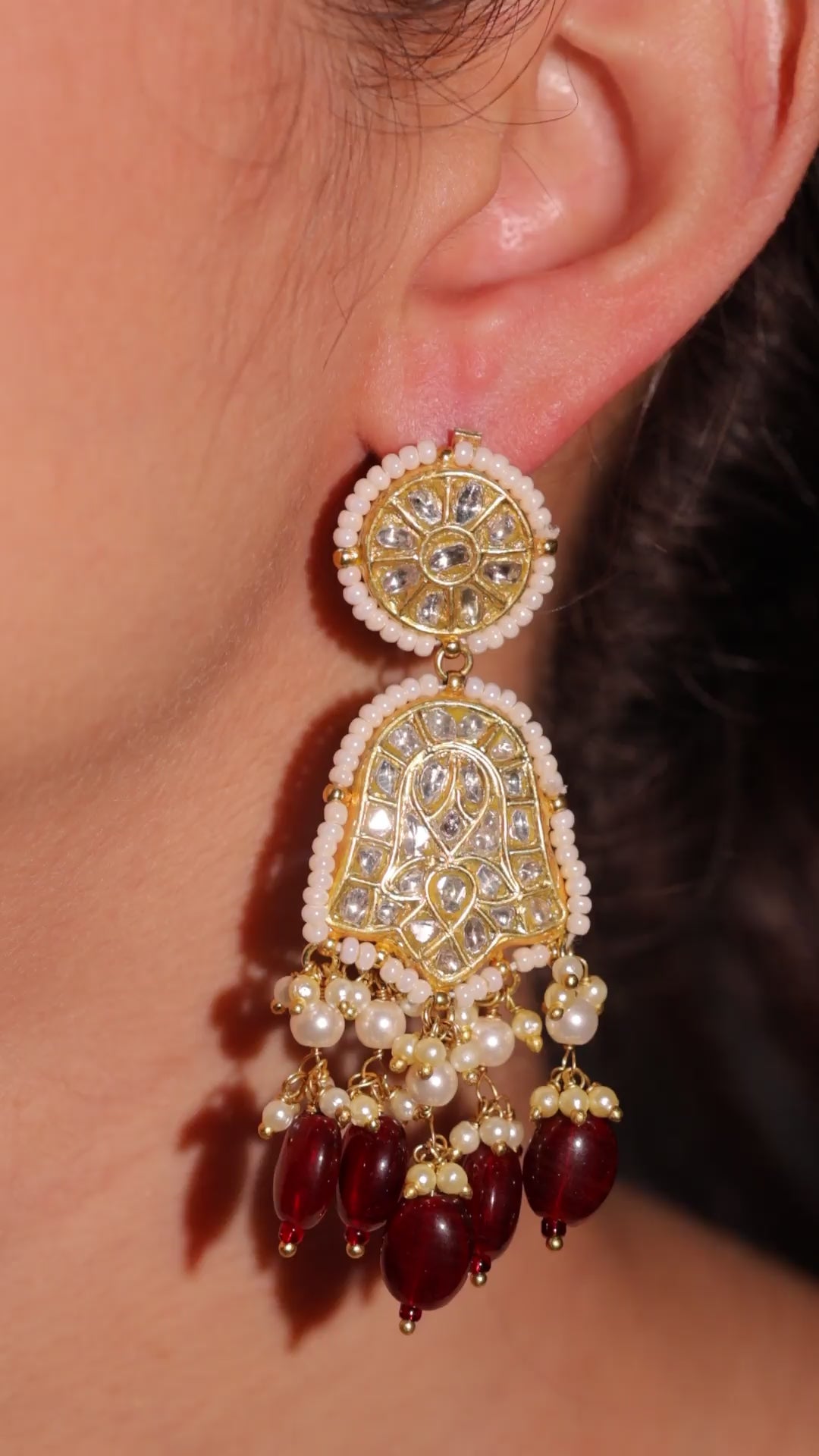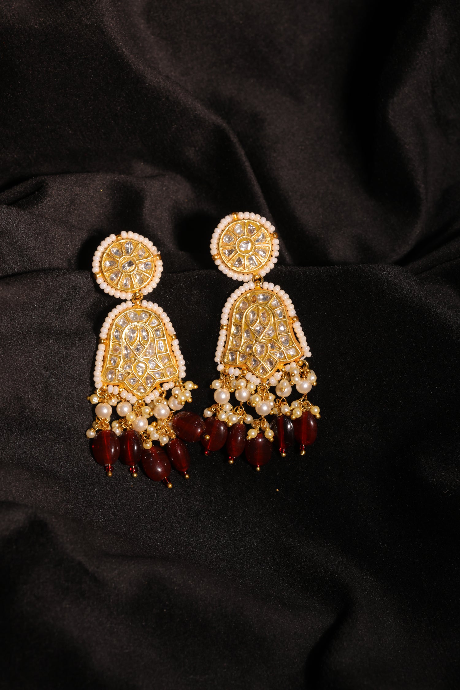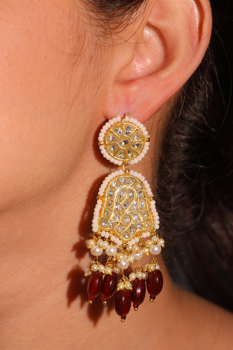 Handcrafted in 22 karat hallmark gold, these earrings feature certified natural syndicate polki stones, framed with delicate pearl edging and finished with deep red garnet drops. A perfect balance of classic charm and regal elegance — ideal for festive and formal occasions.