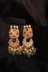 A crescent-shaped section sparkles with a line of clear stones, enhancing the earrings' luminosity. The piece is finished with a fringe of pearls and green stones which bring movement and richness to the overall look.