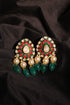 These Emerald earrings combine traditional elegance with a modern aesthetic. The design centers around a circular setting, At the heart of each earring lies a larger clear polki, surrounded by a floral arrangement of polkis. The entire composition is bordered by a rich green frame, adding depth and contrast to the piece.
