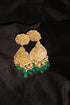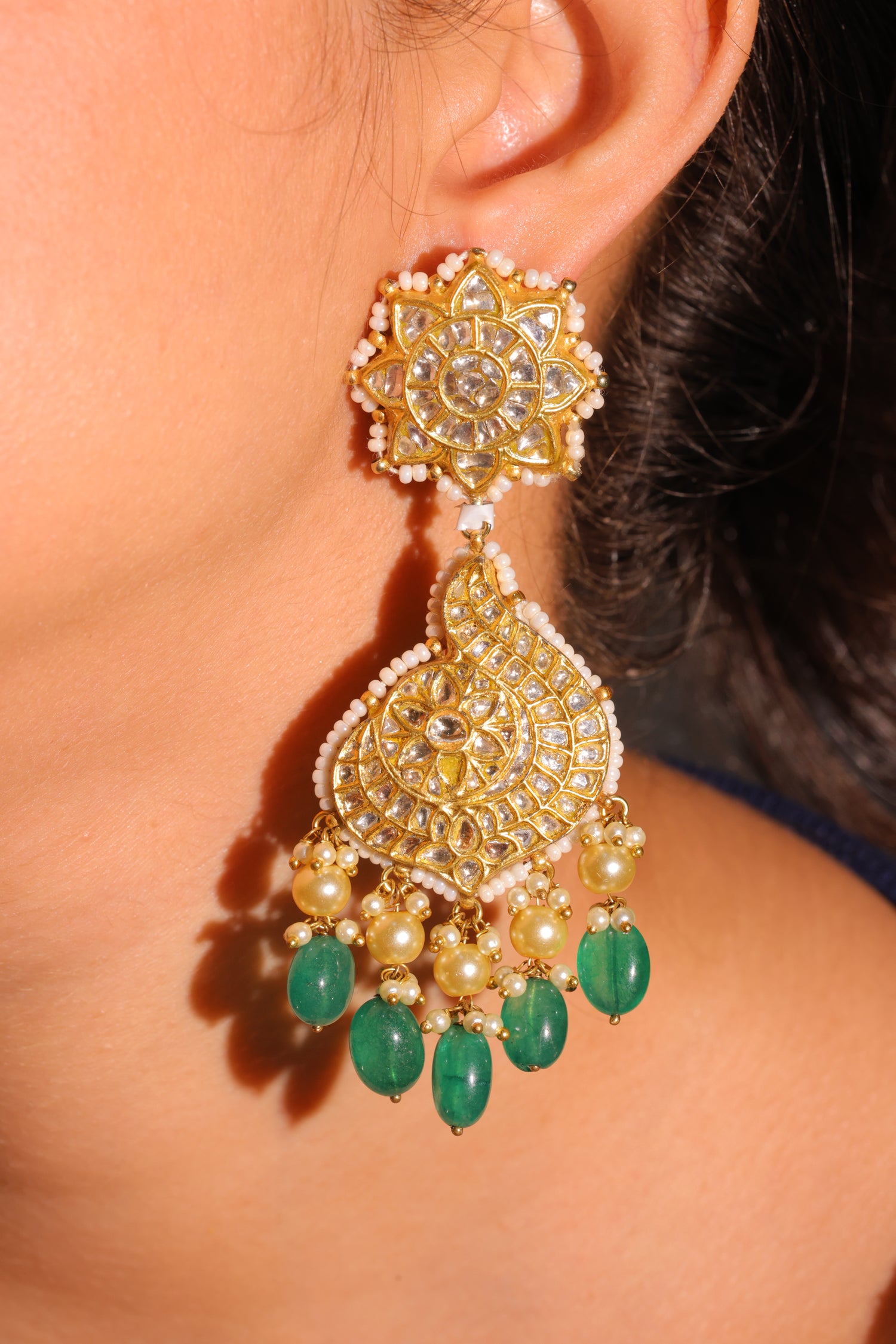These traditional Indian earrings showcase exquisite craftsmanship with a graceful floral or paisley-inspired design. The central body is adorned with classic uncut polki stones, known for their reflective charm and heritage appeal, set against a warm gold base. A delicate row of small pearls outlines the lower edge, adding refinement and texture. Completing the design, green teardrop-shaped stones dangle below, offering a vibrant contrast that enhances the overall elegance and movement of the earrings.