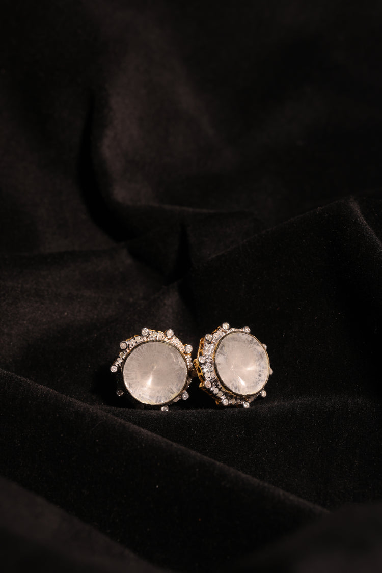 These luminous stud earrings evoke the soft elegance of moonlight, featuring a large, round translucent stone at the center—resembling moonstone or clear quartz. The central gem is encircled by a refined halo of small, sparkling polkis, set in a warm gold-toned frame. The circular design combines traditional craftsmanship with a contemporary aesthetic, making them a versatile accessory for both festive events and elegant everyday wear.