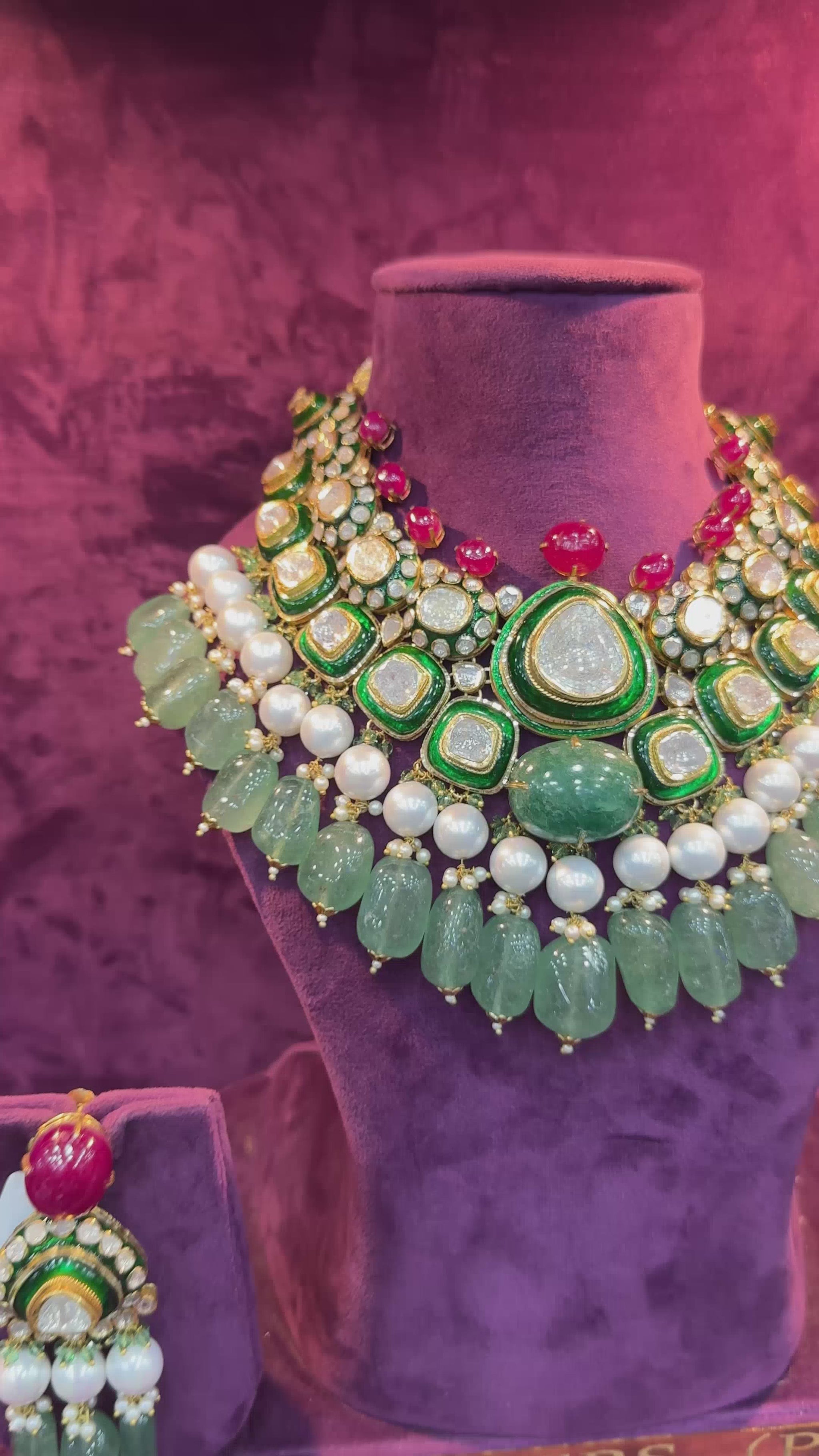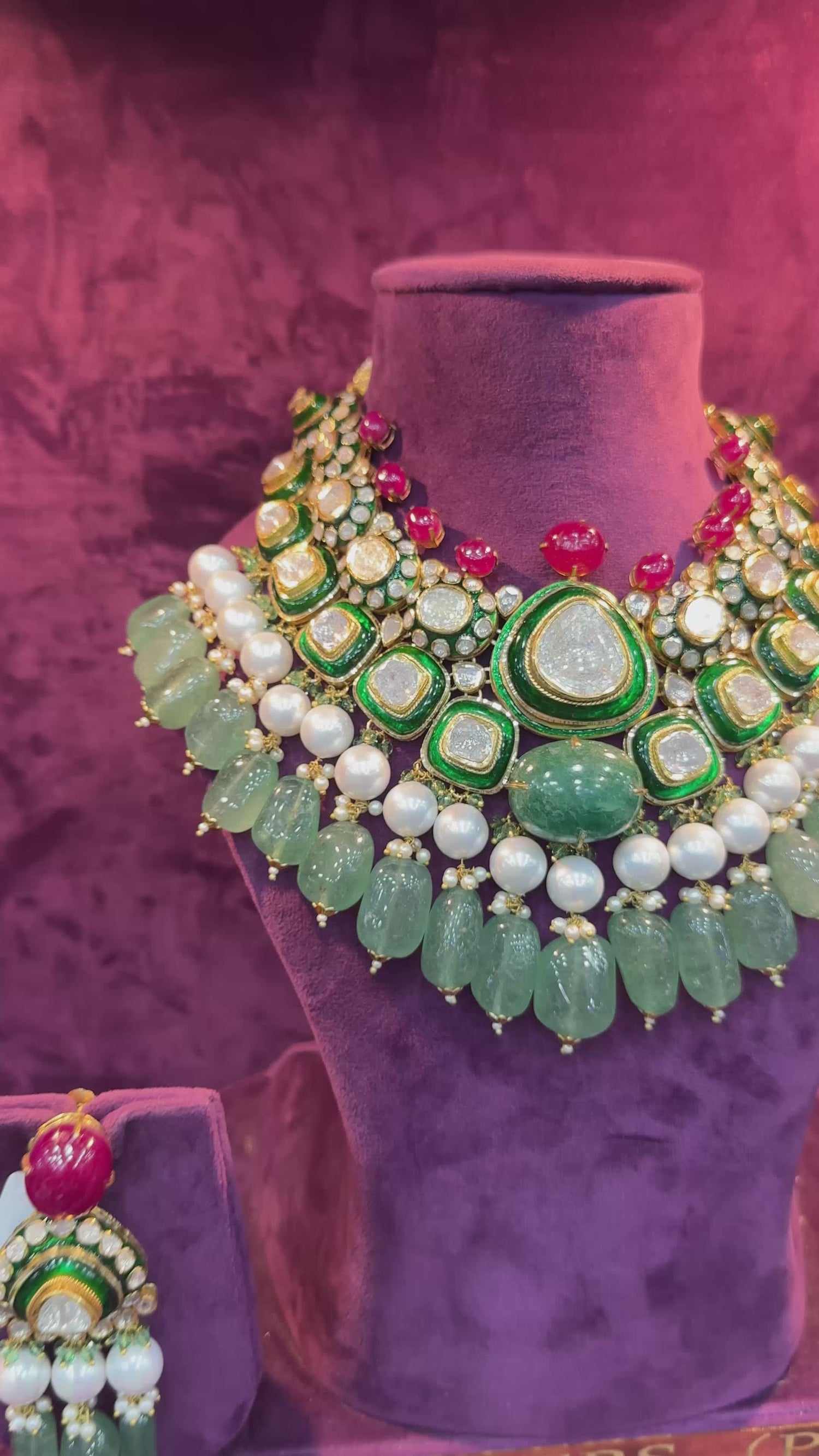 This elaborate necklace set exudes regal elegance, featuring a central design adorned with large, faceted green gemstones framed by smaller polki stones and vibrant green enamel work (meenakari). Accented with rich red stones at the top, the piece is further enhanced by cascading strands of lustrous white pearls. Dangling from the necklace are elongated green beads, adding graceful movement and depth. The accompanying earrings mirror the necklace’s design, incorporating green enamel, red accents, pearls, and matching green bead drops—making this 18K gold set a perfect choice for grand occasions.