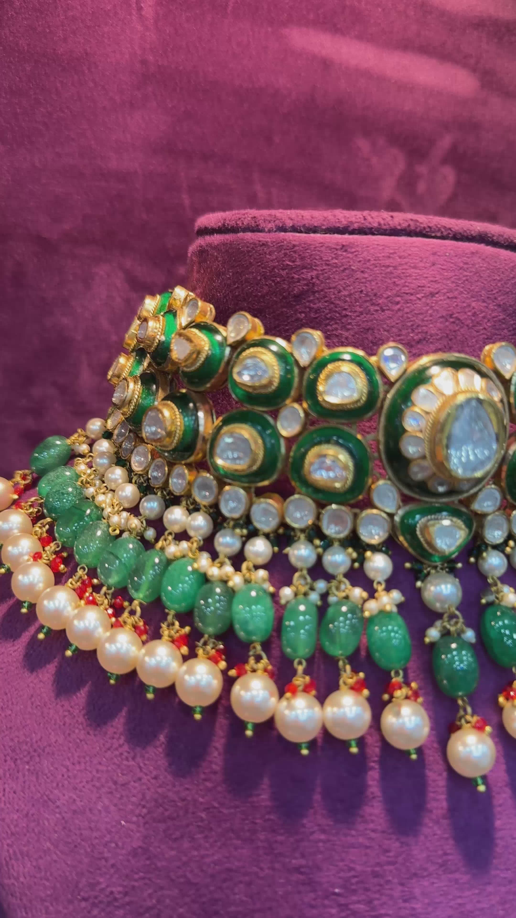 This ornate choker-style necklace exudes traditional grandeur with a contemporary flair. The design features a wide band richly adorned with alternating rows of emerald green beads and lustrous white pearls. A striking, oval-shaped central pendant showcases polki at its center, framed by delicate detailing and smaller polkis. The lower edge of the necklace is finished with elegant pearl and green bead drops, adding movement and dimension. Matching earrings echo the necklace’s motifs, including the green enamel work, pearl accents, and a refined central ornament.