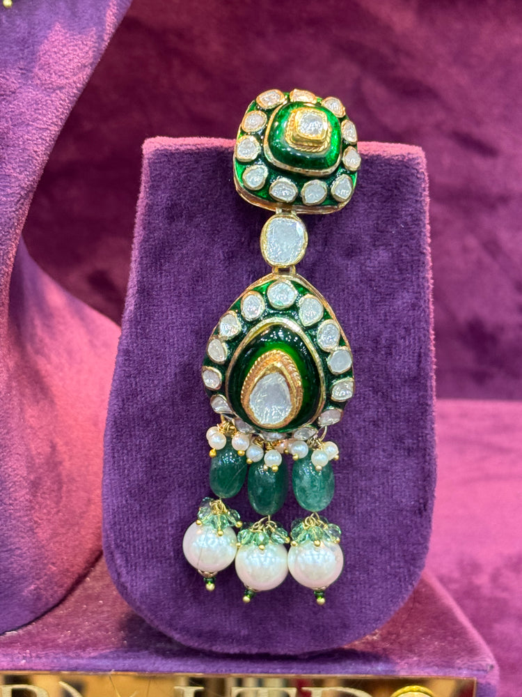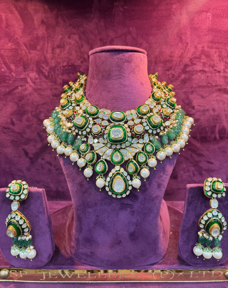 This elaborate necklace set showcases a prominent choker-style necklace paired with matching dangle earrings, crafted in a traditional Indian design. The pieces are richly embellished with vibrant green enamel work (meenakari), large emerald green central stones, and uncut Polki diamonds, all set in an ornate 18K gold framework. Intricate white and green detailing surrounds the main elements, while clusters of lustrous white pearls gracefully dangle from the lower edges, adding elegance and movement. The earrings mirror the choker’s design, completing this opulent and timeless ensemble.
