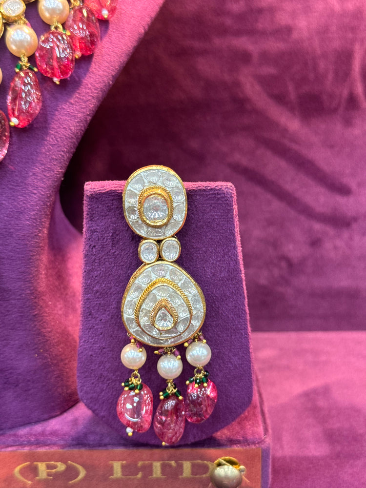 This exquisite Indian necklace set features a regal design centered around a grand pendant and coordinated earrings. It is set in 18kt gold. The set evokes timeless elegance and traditional luxury, making it an ideal choice for weddings and festive occasions.