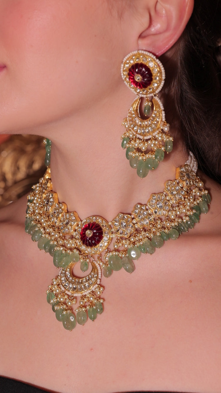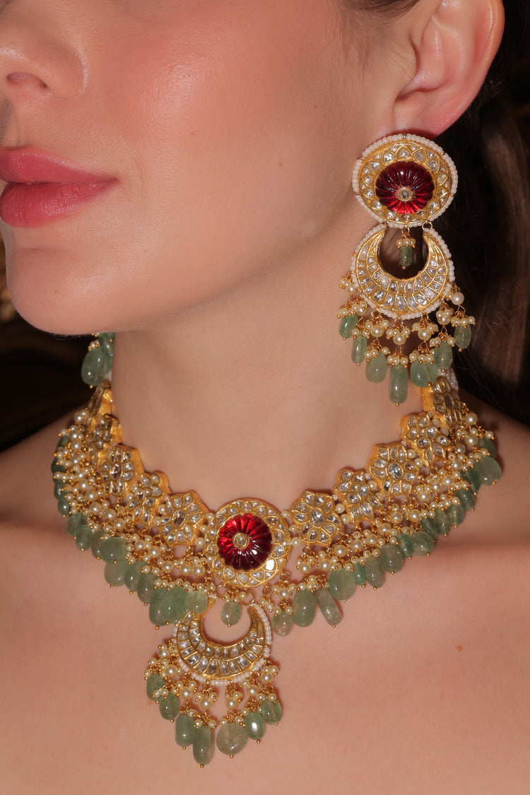 Classic & verstile, this gorgeous choker set is finely handcrafted in 22KT Gold , studded with gemstones & natural syndicate polki diamonds