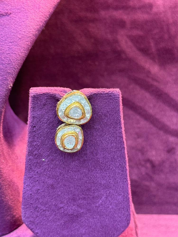 Large Polki diamonds, each set in a 18kt gold and framed by a textured border. The arrangement of these bold elements creates a striking silhouette, perfect for occasions that call for distinctive, heritage-inspired elegance.