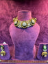 This striking 18K choker-style necklace set features a series of ornate, gold-crafted segments arranged in a broad silhouette. Each segment is intricately adorned with black and green enamel work, highlighting traditional meenakari craftsmanship, and is studded with uncut diamonds (Polki). The central motif—a large, oval-shaped element—serves as the focal point, surrounded by progressively smaller segments tapering toward the neckline. Matching dangle earrings mirror the necklace’s design, echoing the gold and green enamel detailing with the same stone embellishments. This opulent set is ideal for weddings and ceremonial occasions.