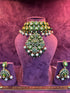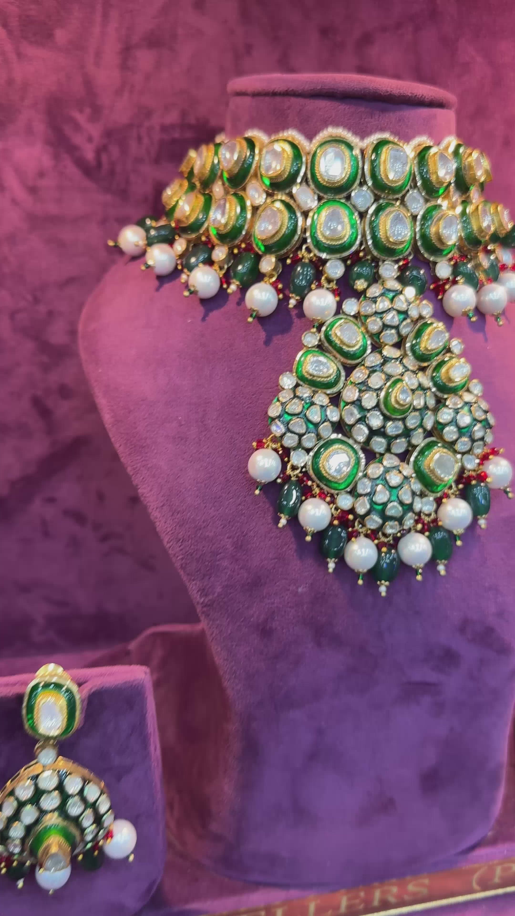 This exquisite 18K necklace set is a masterpiece of traditional Indian craftsmanship, featuring a prominent choker-style necklace paired with elegant drop earrings. Intricately detailed, the set is embellished with lustrous white pearls and vibrant green gemstones—set within a gold-toned framework. Rich green and white meenakari (enamel) work enhances the ornate design, surrounding clusters of clear polki stones. The bold central pendant and matching earrings create a harmonious, regal aesthetic, ideal for weddings or grand celebrations.