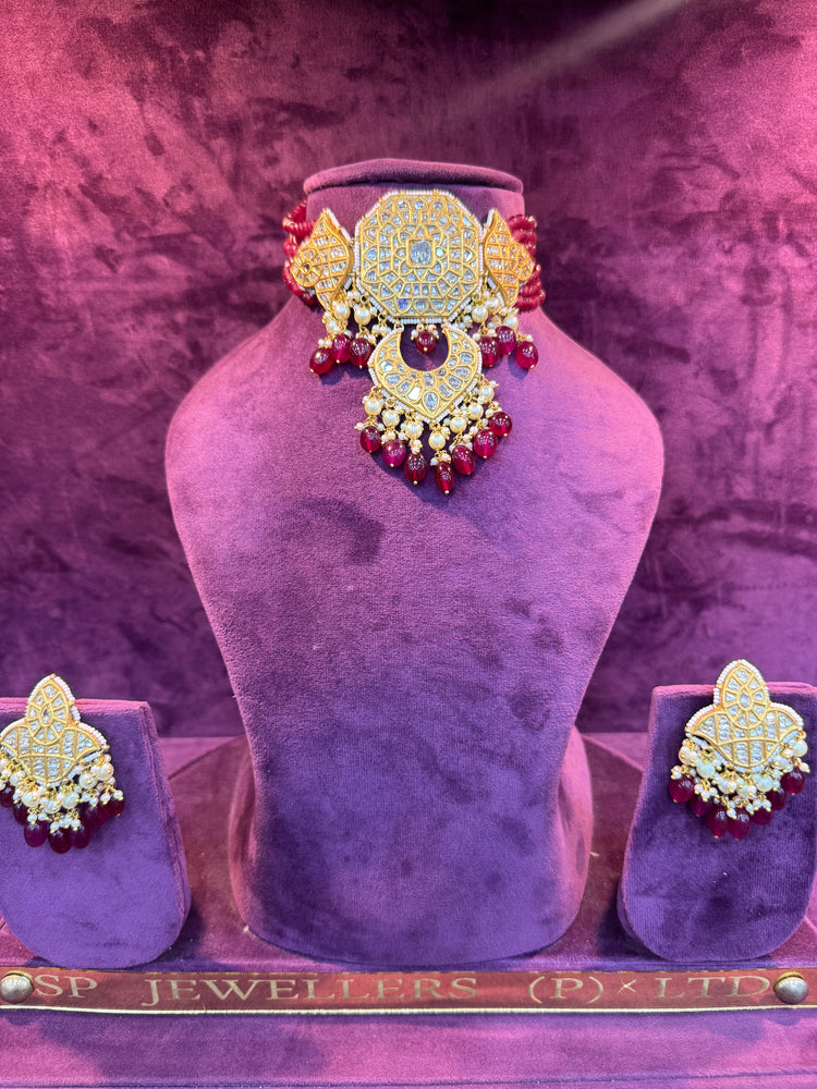 This traditional choker-style necklace features intricate gold detailing and a bold geometric pendant as its focal point. The ornate centerpiece is enhanced by delicate dangling elements, adding depth and movement to the design.