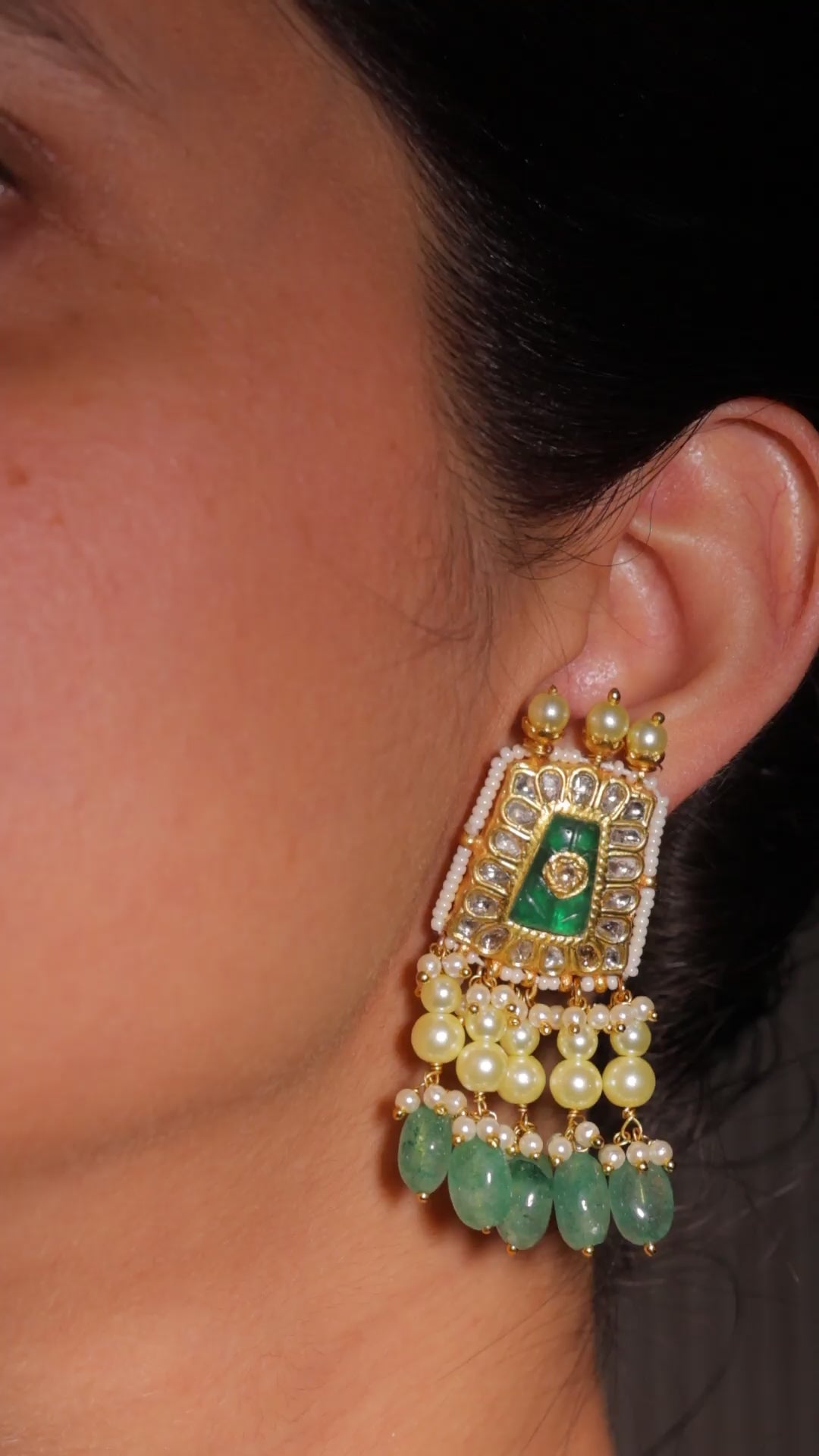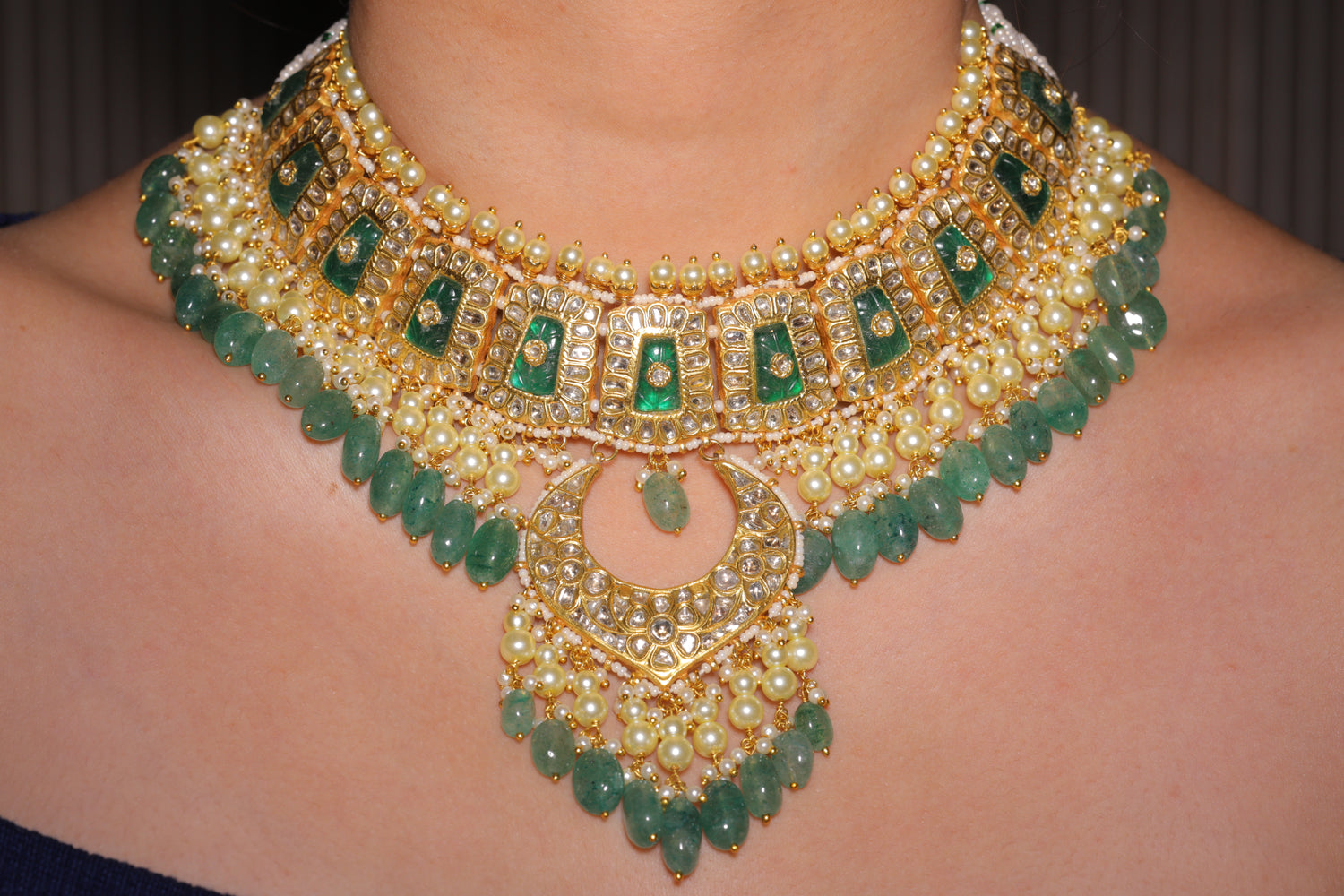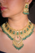 A regal statement crafted in 22 karat gold, this bridal necklace features authentic uncut Polki diamonds set in a traditional yet timeless design. The green emerald drops paired with strings of creamy pearls add depth and color to the set, making it ideal for grand weddings and royal occasions. Accompanied by matching earrings that mirror the intricate craftsmanship.