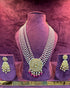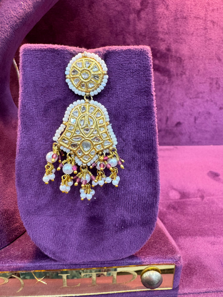 This traditional necklace set features multiple strands of small white pearls, creating an elegant layered look. These strands are attached to a large, circular gold and polki pendant. From the base of the pendant, several deep red beads dangle gracefully, adding vibrant contrast and movement. The set is completed with matching earrings that mirror the pendant’s design, incorporating pearls, floral patterns, and red bead drops.
