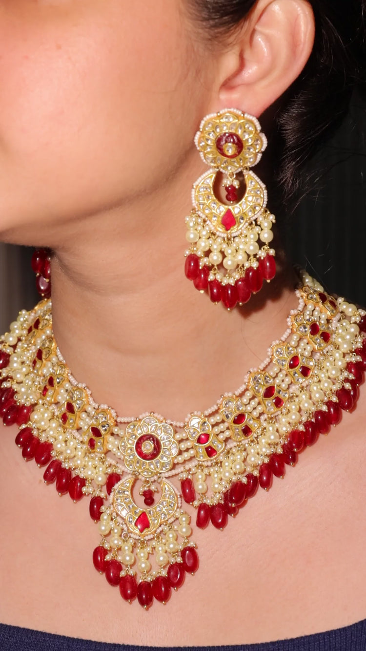 A regal ensemble crafted in 22 karat gold, this bridal set features certified natural syndicate polki stones, rich red enamel accents, and cascading layers of pearls and deep ruby-red drops. Paired with statement earrings, this set is designed to command attention at the most cherished celebrations.