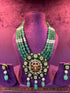 This exquisite necklace set features a multi-strand design of polished green stones, elegantly interspersed with white pearls near the top of each strand. The centerpiece is a large, ornate pendant —surrounded by multiple polki settings. Matching earrings mirror the pendant’s design, featuring green stones, pearls, and similarly framed polki elements, creating a harmonious and luxurious ensemble.