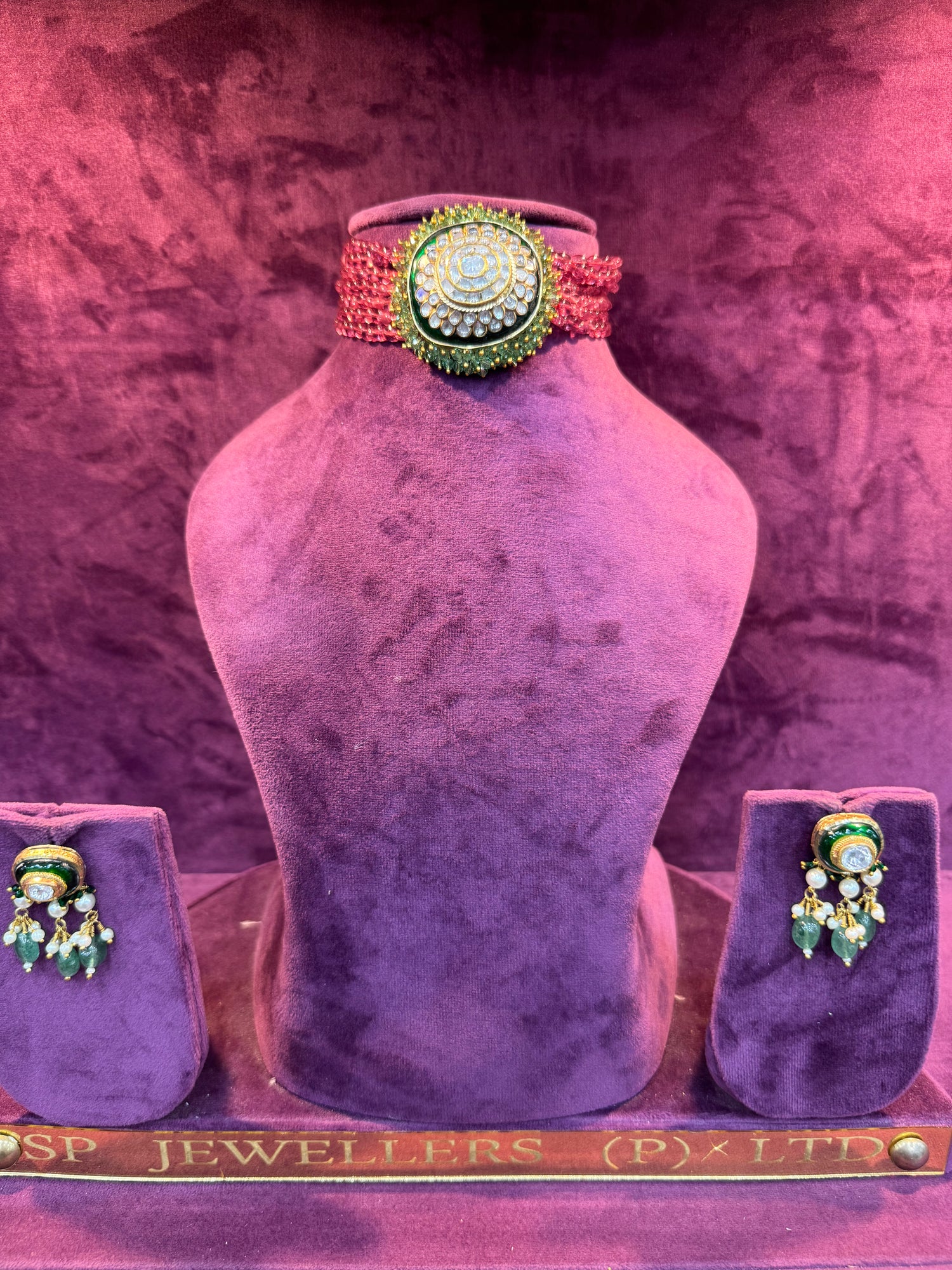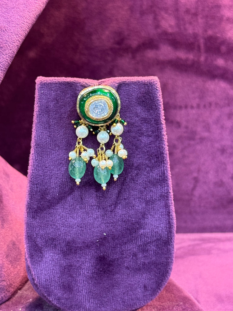 At the center hangs a large, circular pendant with a green border, a white center, and intricate gold detailing. The pendant is complemented by matching earrings—with small hanging pearls and green stones adding elegance and movement.