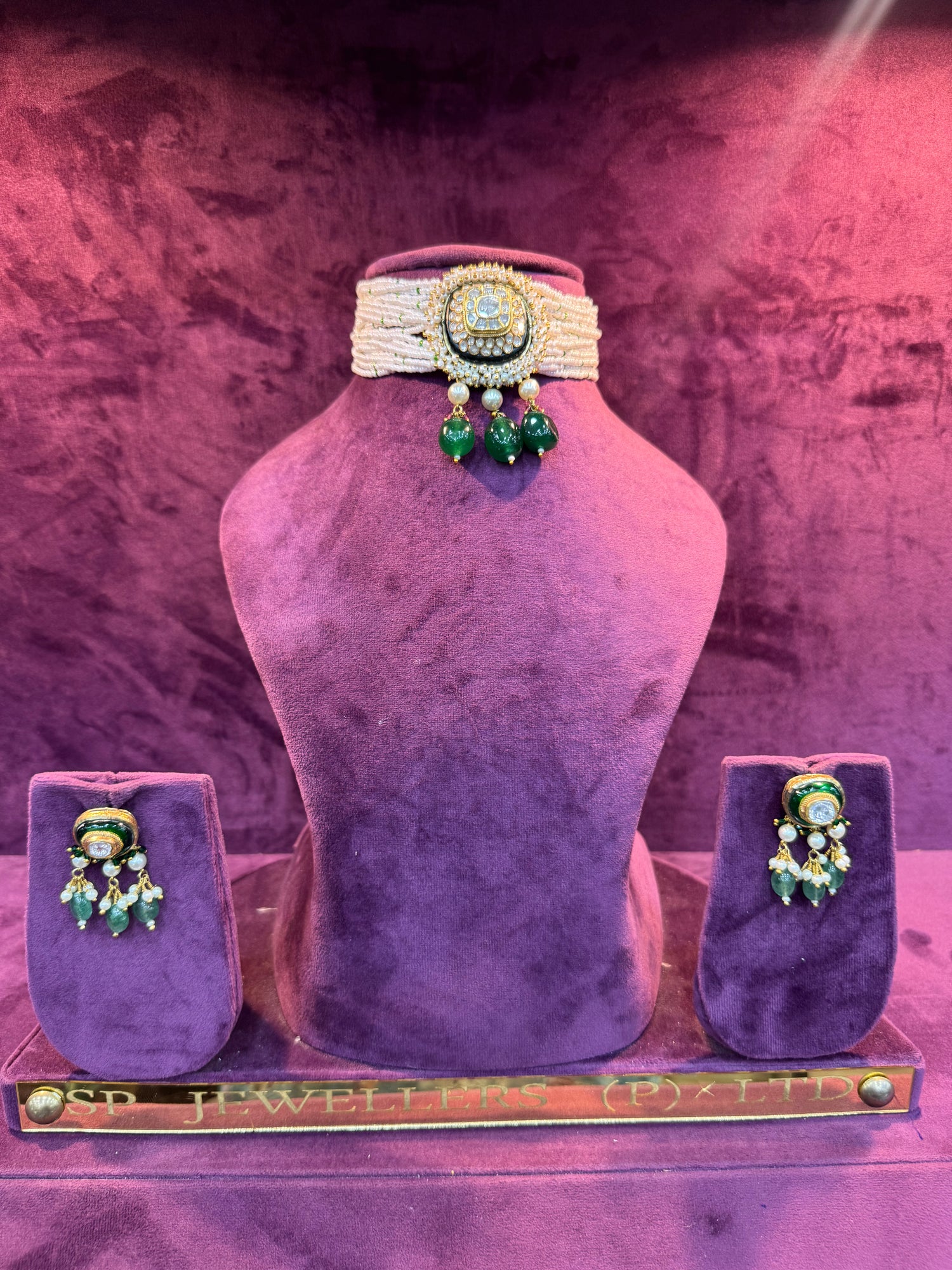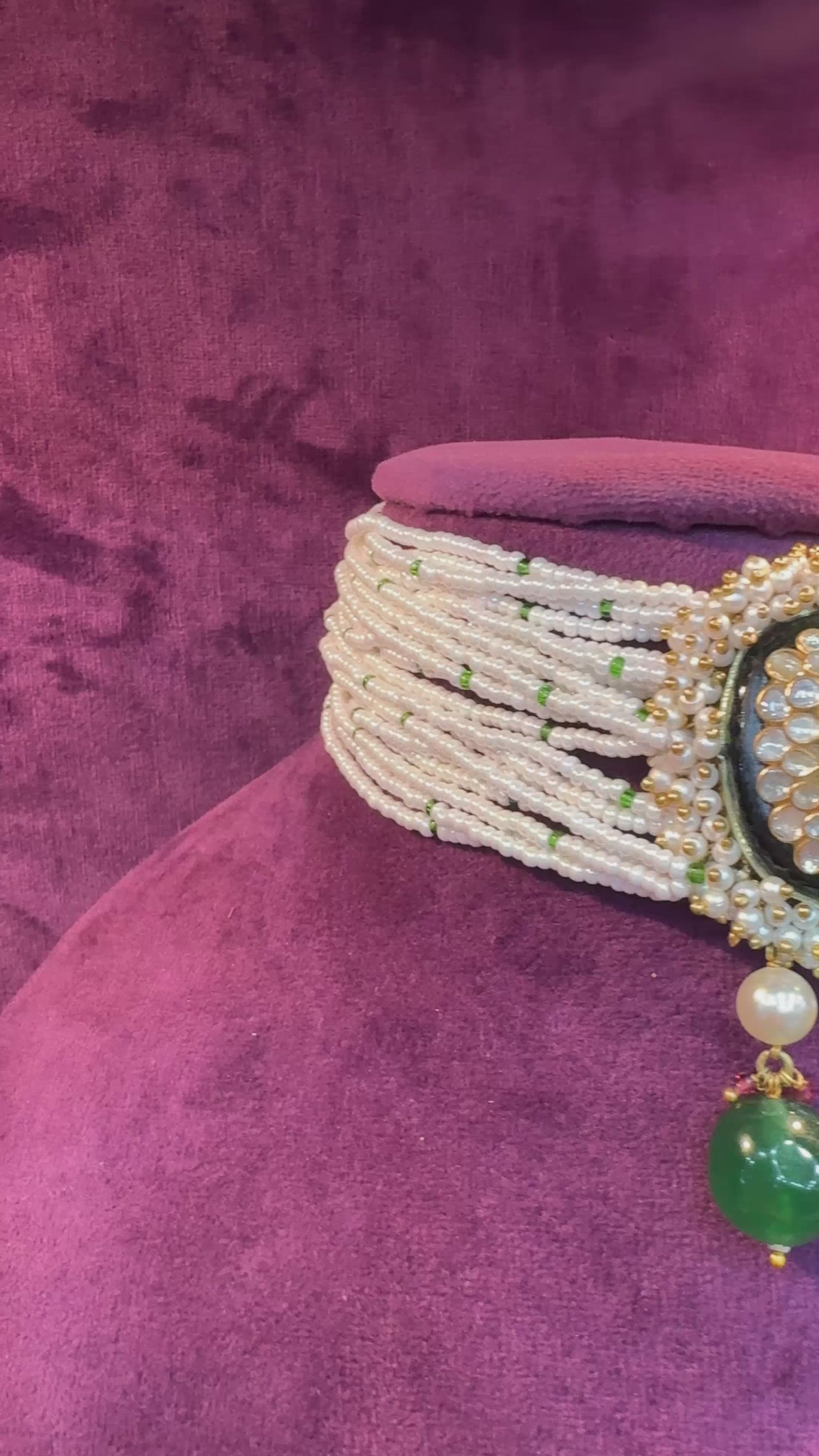 This traditional choker-style necklace features a colored beaded strand that sits elegantly around the neck. At the center is a square, ornate gold-polki pendant with intricate detailing. Dangling from the pendant are three green teardrop-shaped stones, evoking the look of emeralds.