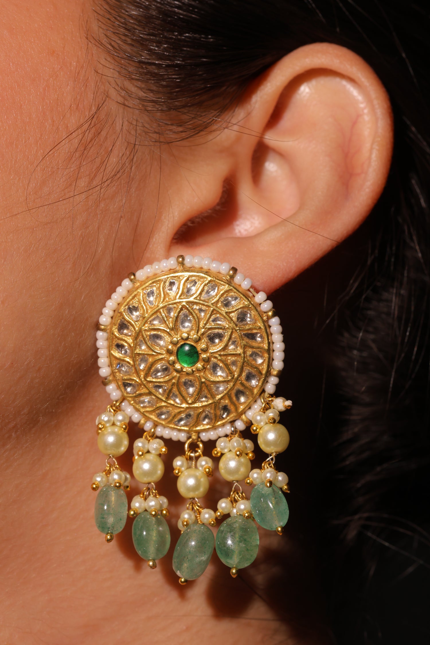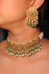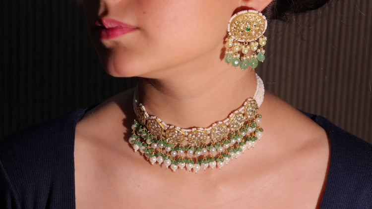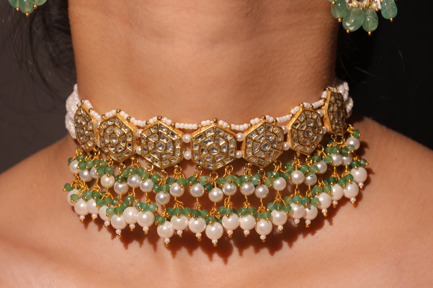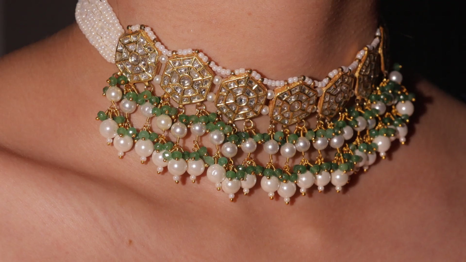 Crafted in 22 karat hallmark gold, this exquisite choker showcases certified natural syndicate polki set in hexagonal motifs, accented with strings of pearls and vibrant green beads. A graceful blend of traditional design and contemporary charm — perfect for weddings and festive soirées.