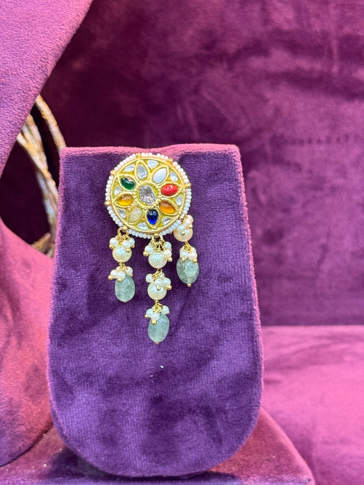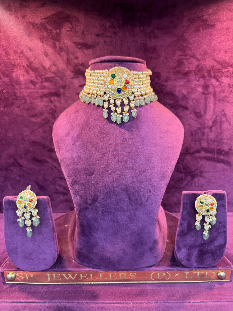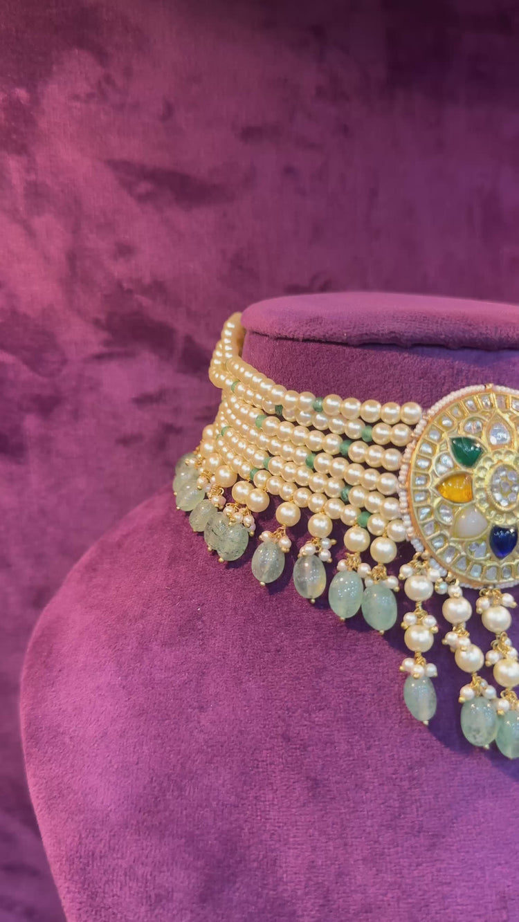 This choker-style necklace showcases multiple strands of lustrous white pearls that create a rich, layered look. At the center sits a striking circular pendant, embellished with polkis set in a detailed gold. Below the pendant, smaller strands of pearls cascade gracefully, each ending with dangling green stones that add movement and vibrant contrast. The set includes matching earrings that mirror the pendant’s design, completing this elegant and traditional ensemble—perfect for festive occasions or wedding wear.