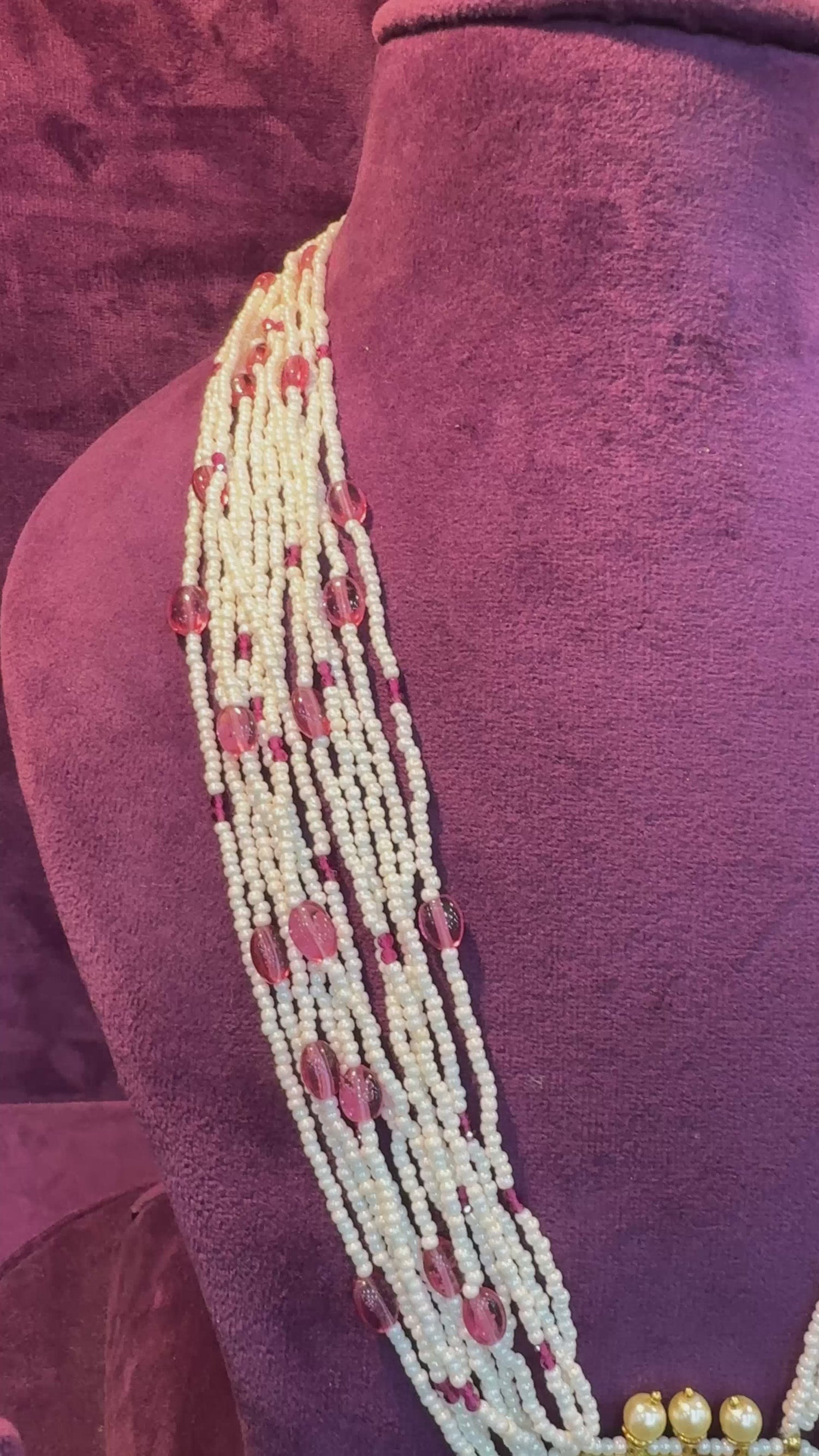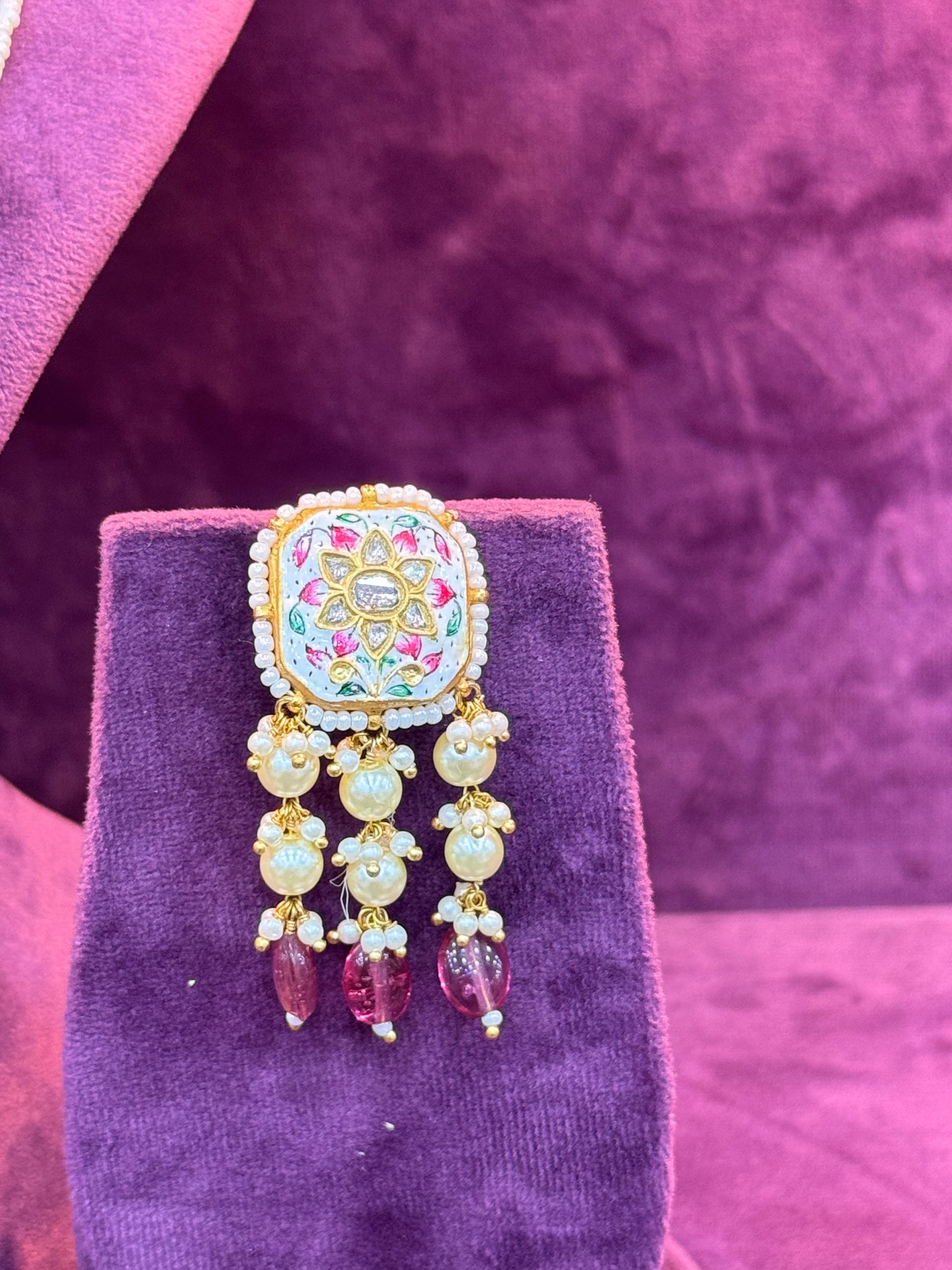 This elegant necklace features multiple strands of small white beads interspersed with soft pink beads, creating a delicate and graceful look. The centerpiece is a large pendant adorned with a detailed floral design in pink, green, and gold tones, with polkis. Dangling below the pendant are multiple strands of pearls and pink beads, adding movement and charm. The set includes matching earrings.