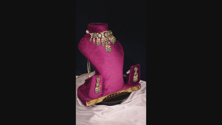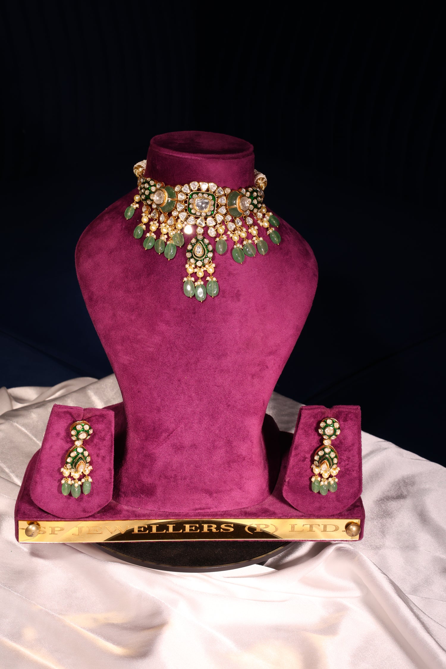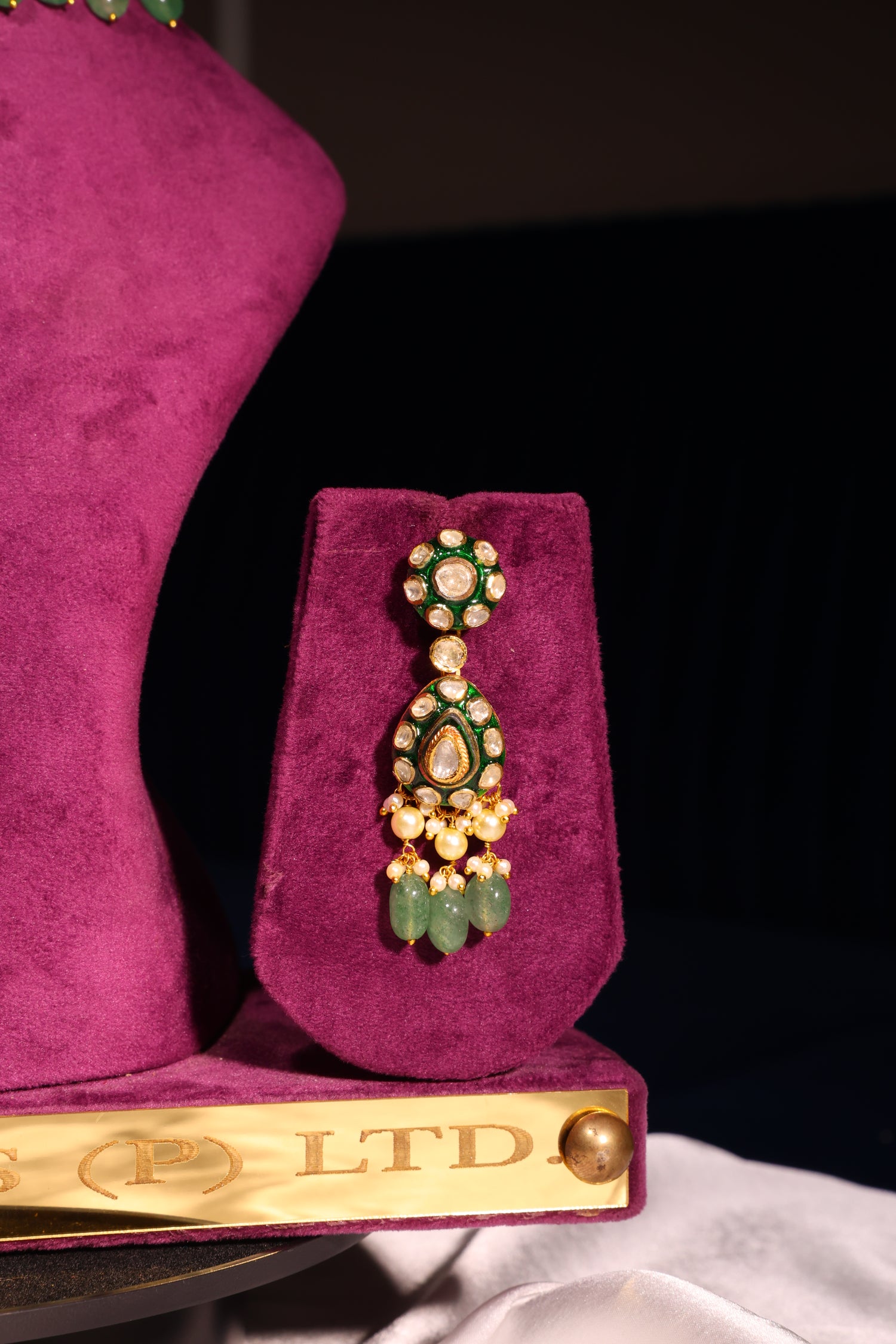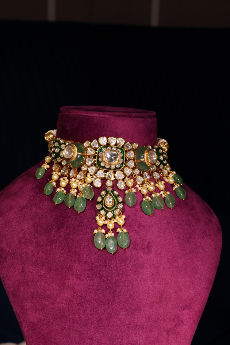 he Emerald Drop Statement Necklace is a stunning piece crafted in 18K gold that balances bold design with elegant details. Featuring a gold base adorned with large, faceted clear stones and smaller round green gemstones, it centers around an ornate design with a prominent clear stone surrounded by vivid green gems. Graceful green teardrop-shaped pendants hang delicately from the bottom, adding movement and sophistication. Perfect for festive occasions and evening events, this necklace makes a striking statement.