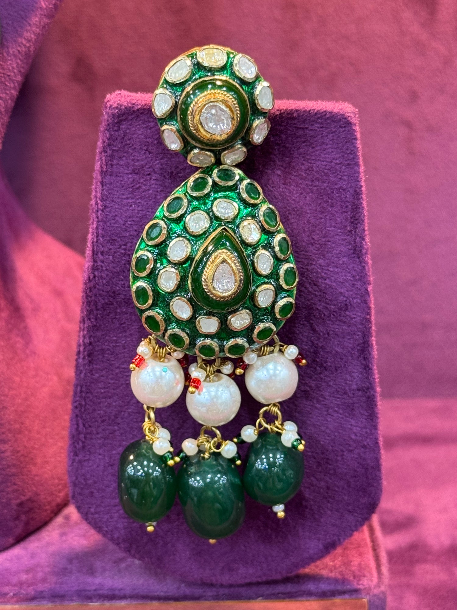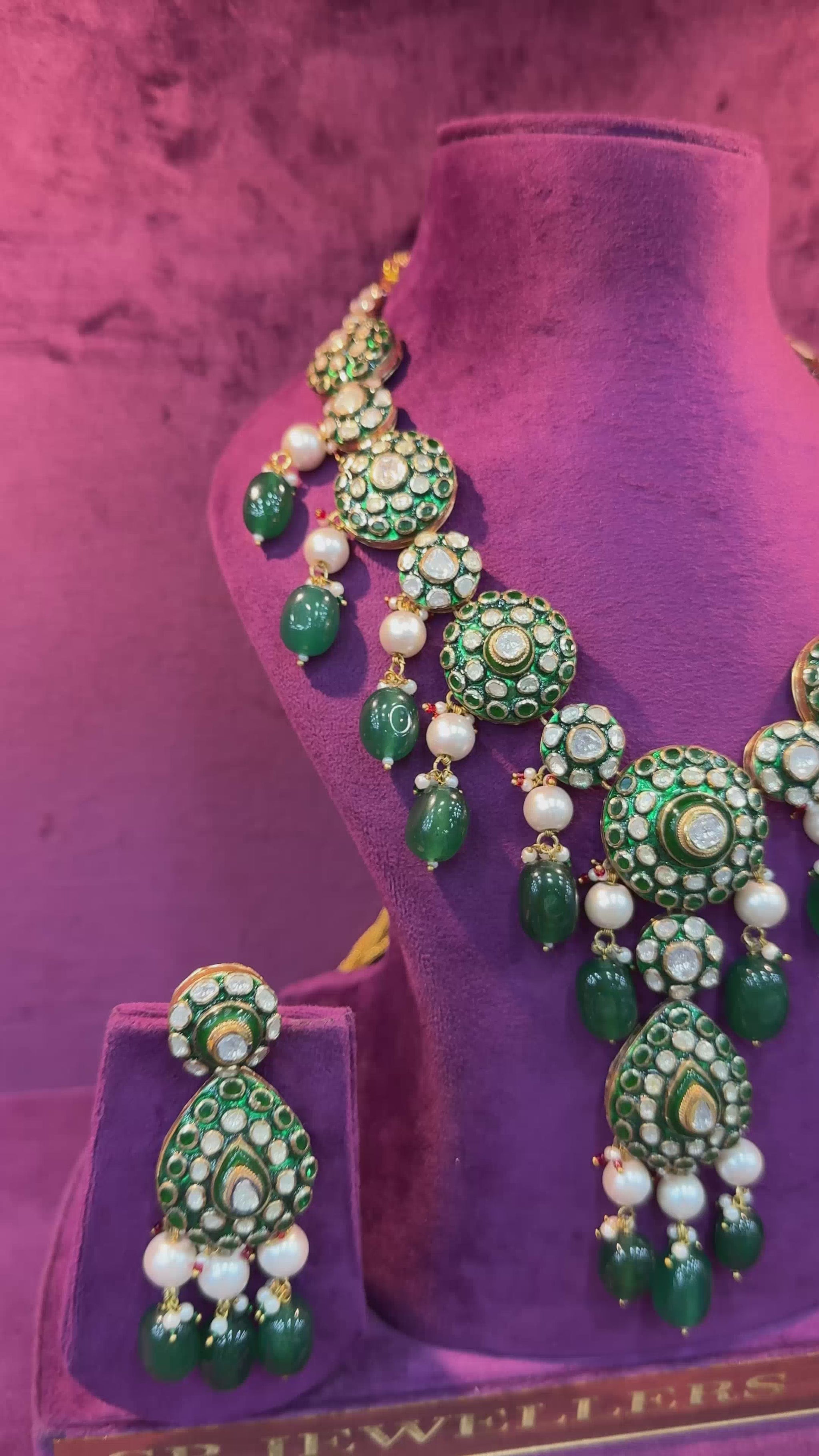 This exquisite necklace set captures the essence of traditional Indian artistry, featuring a bold central necklace and coordinating dangle earrings. The design is richly detailed with vibrant green enamel work—and is adorned with sparkling Polki diamonds, set in 18k gold. A fringe of lustrous white pearls and smooth, polished green beads or emeralds hangs elegantly from the base, adding depth, movement, and regal charm to the overall look. Perfect for bridal wear or grand festive occasions.