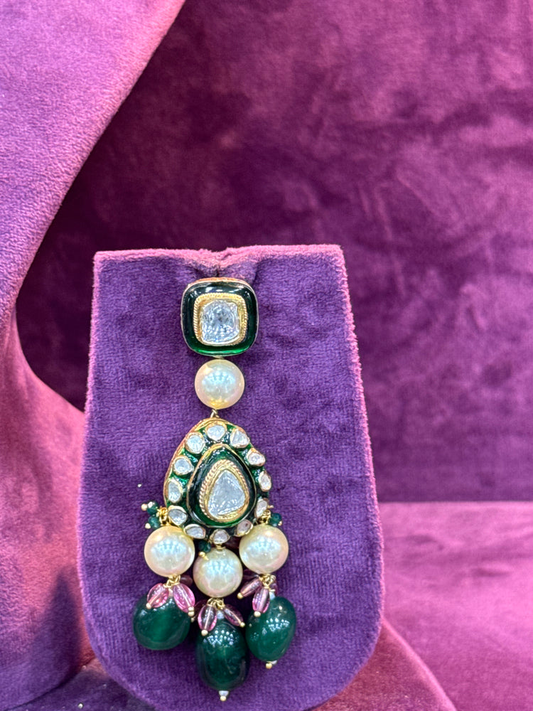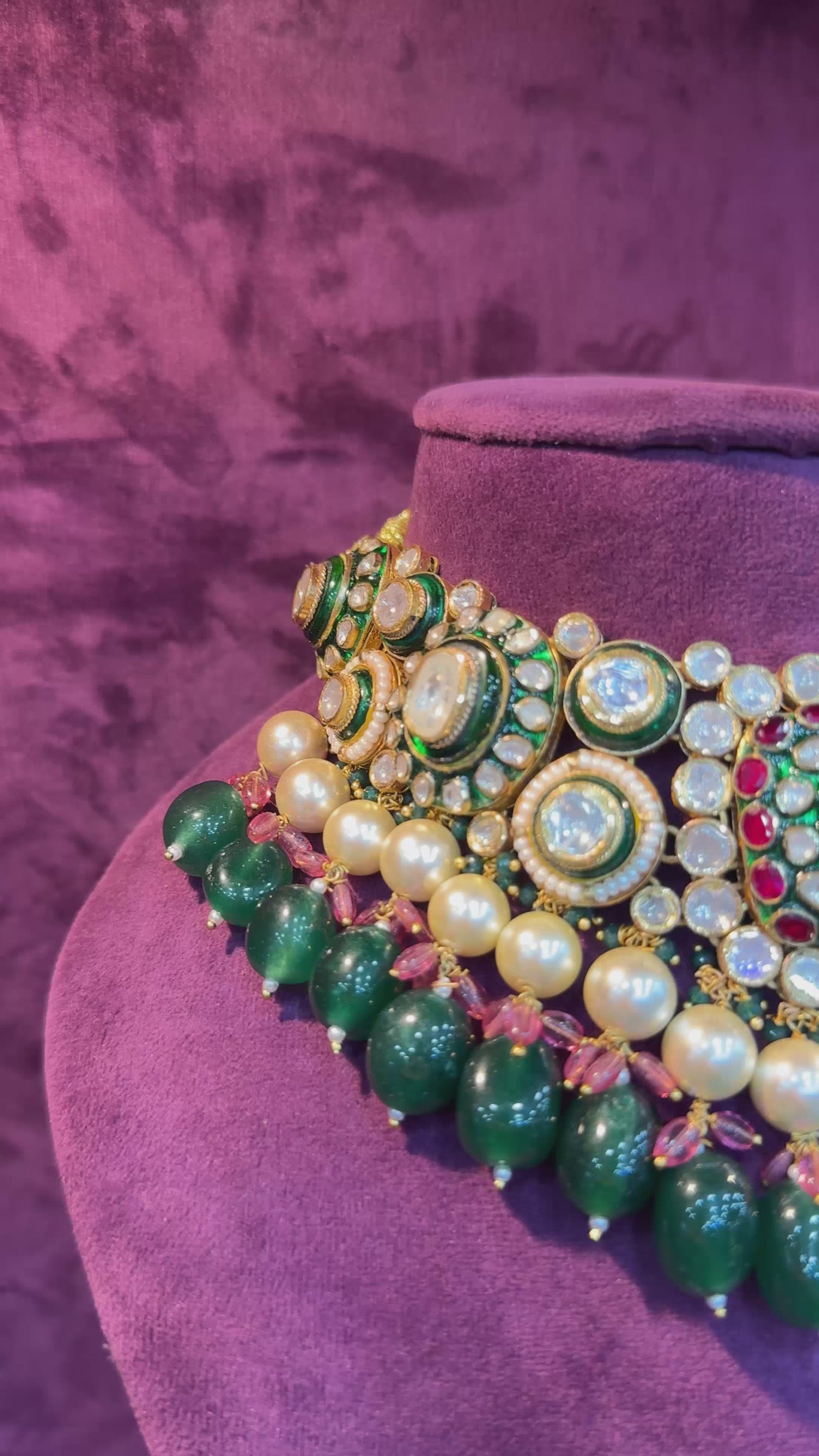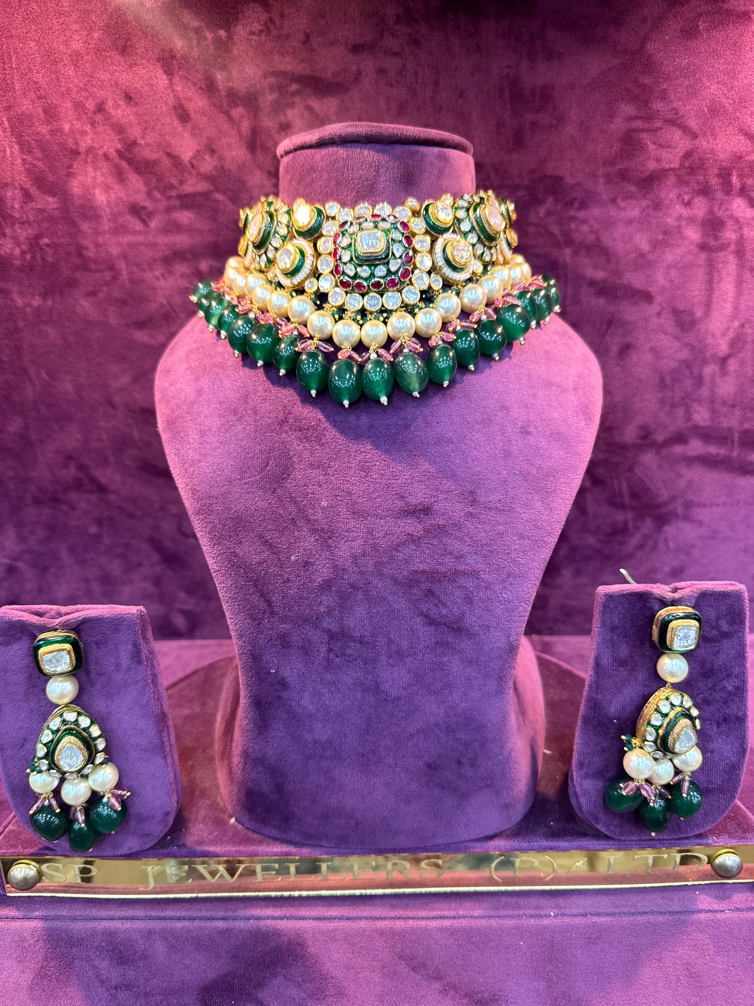 This traditional Indian choker necklace features an ornate gold base, richly embellished with polkis, green stones, white pearls, and subtle red accents. At the center sits a square pendant framed by smaller polkis and stones, anchoring the symmetrical design. A row of green stone drops adds fluidity and grace to the bottom edge. The set includes matching earrings. Ideal for festive or ceremonial wear, this set is displayed on a purple velvet stand that enhances its vibrant colors and craftsmanship.