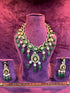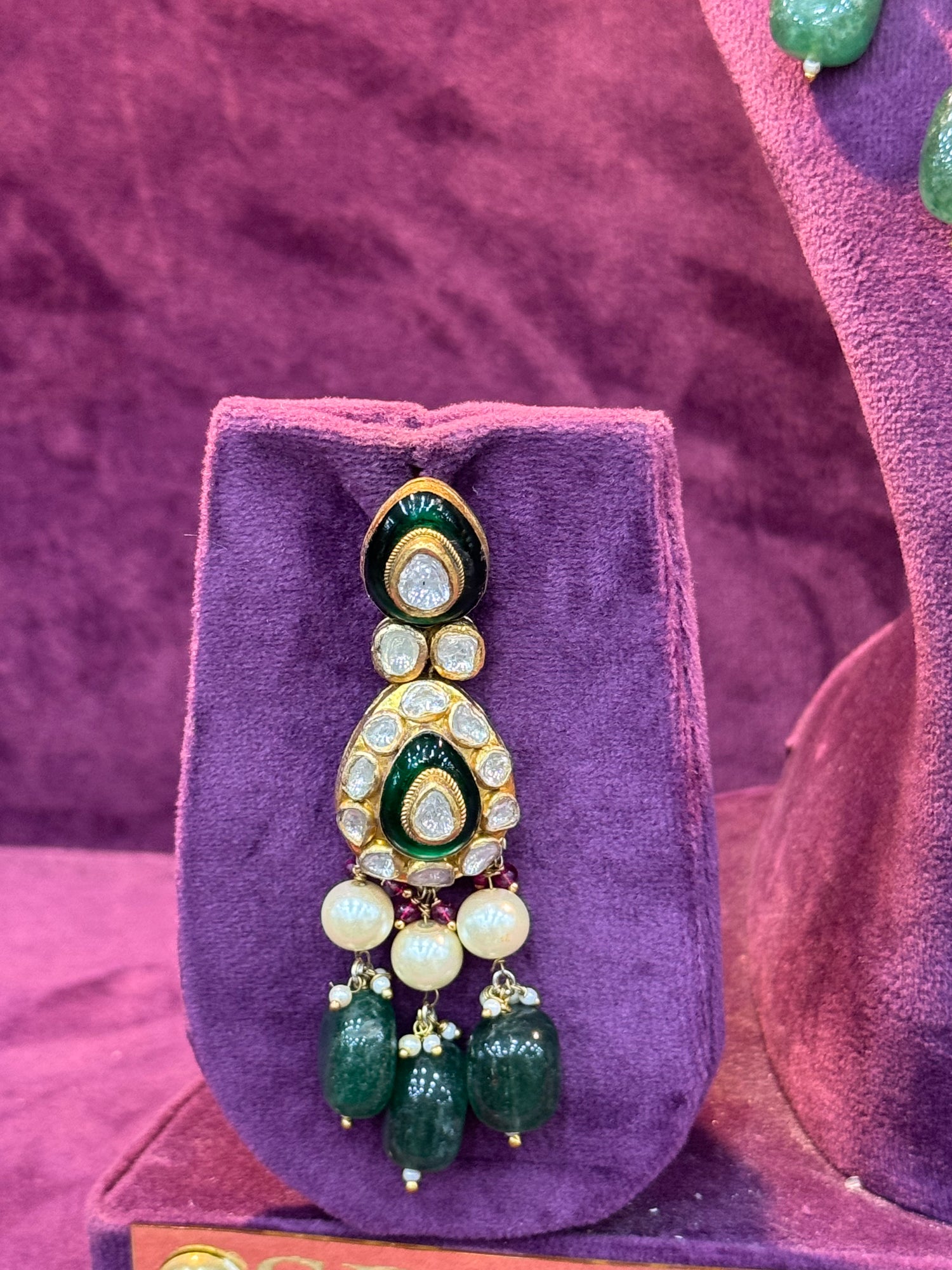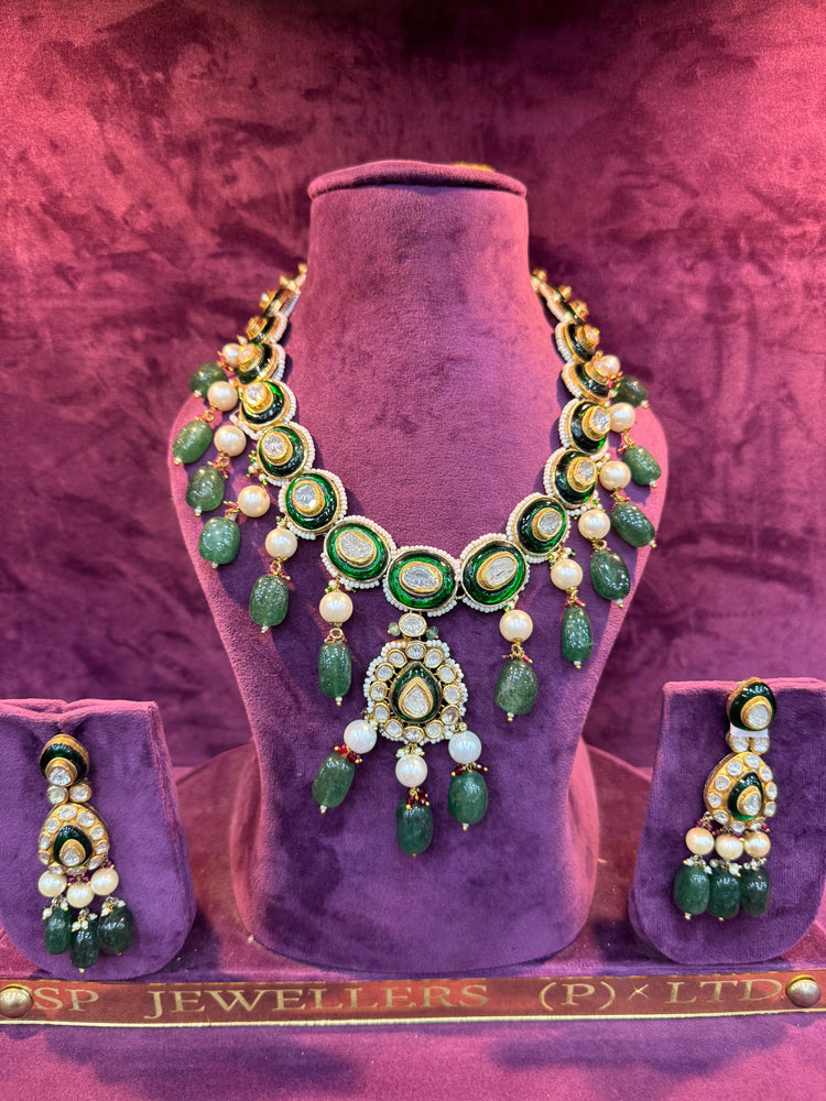 This elegant necklace set showcases a gold base with intricate enamel detailing in green and white. Adorned with luminous pearls and polkis, the design centers around a prominent pendant featuring a larger piece. Delicate pearl and emerald drops enhance the pendant’s ornate appeal. The set includes matching earrings that mirror the necklace’s design, creating a cohesive and traditional look, ideal for festive or ceremonial occasions.