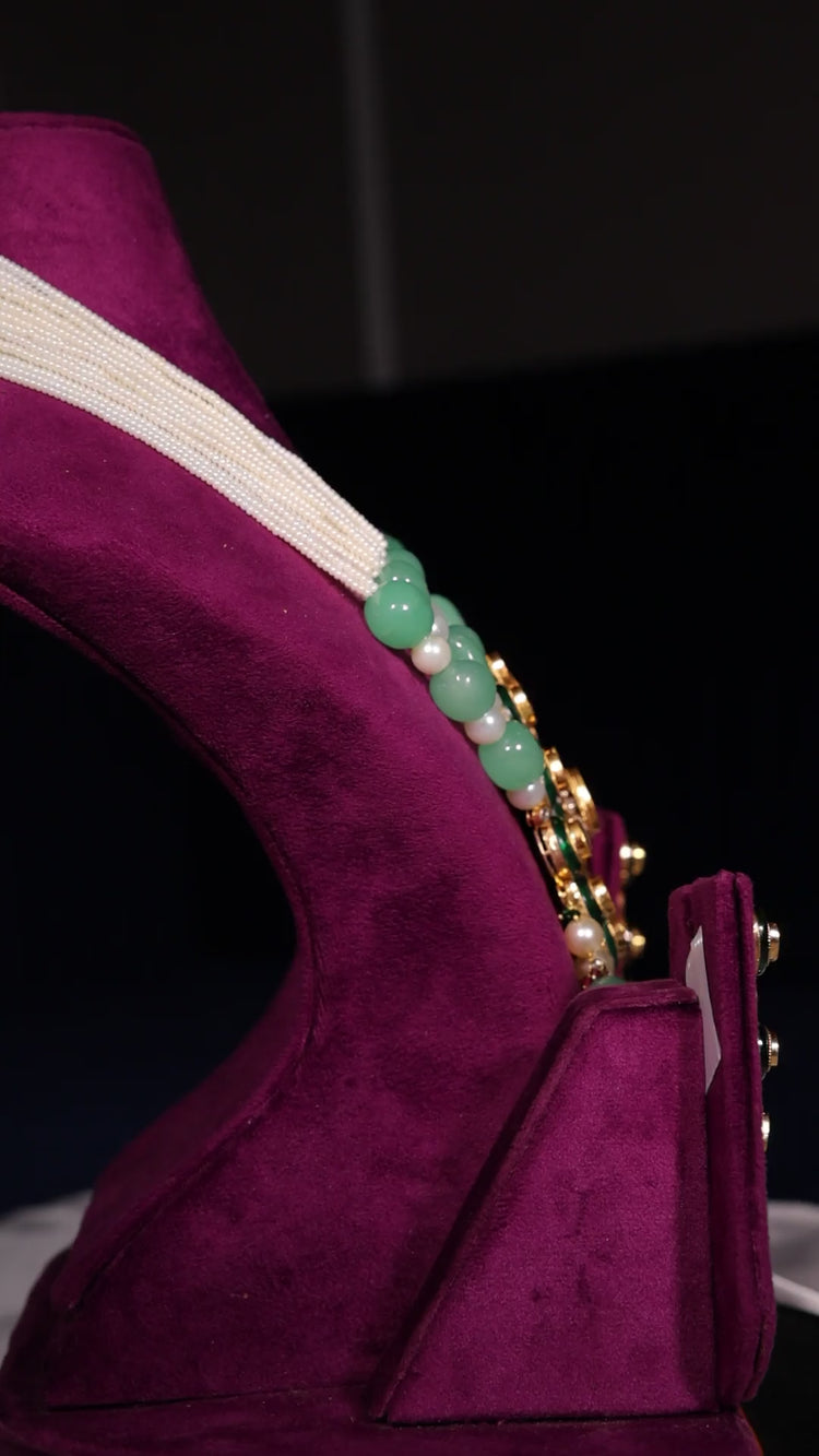 This stunning necklace features multiple strands of small white beads at the top that gracefully transition into larger light green beads and lustrous pearls. The centerpiece is an ornate pendant showcasing a teardrop-shaped polki set. Matching earrings complement the set with green and clear stones set in gold accents. Crafted in 18Kt gold, this set blends traditional craftsmanship with contemporary style.