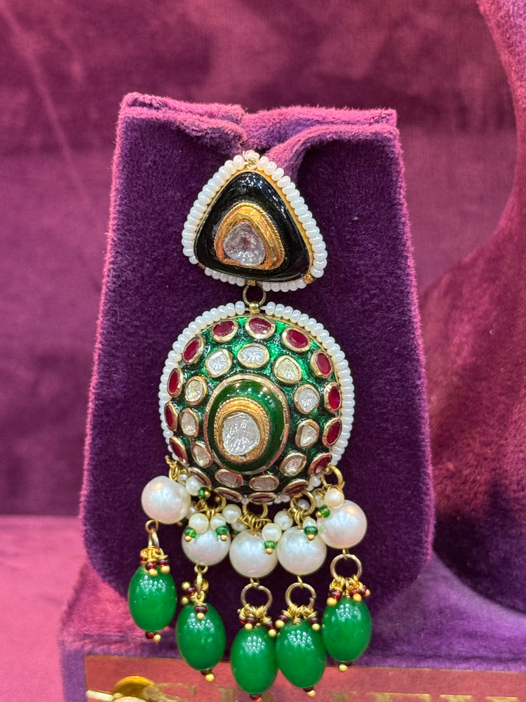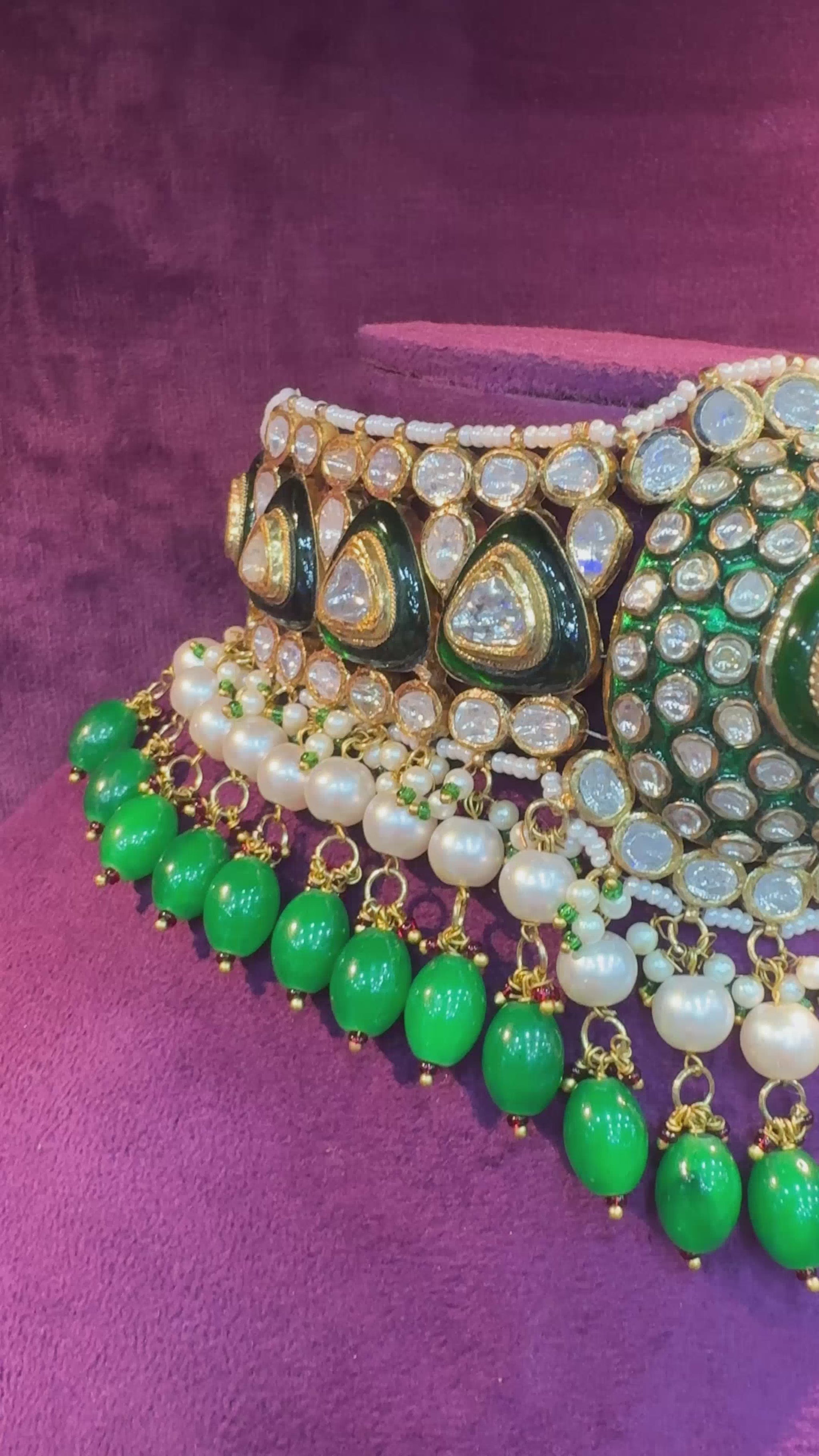 This elaborate choker-style necklace showcases traditional Indian craftsmanship with an ornate structure and luxurious detailing. The main body is adorned with Polki—set in 18kt gold. Rich dark green meenakari work enhances the intricate design, adding depth and contrast. Along the lower edge, a line of delicate white pearls softly drapes beneath the choker, followed by a vibrant row of green teardrop-shaped beads that provide dynamic movement and a striking burst of color. The centerpiece of the necklace is a prominent pendant that integrates seamlessly into the choker’s regal aesthetic, making it ideal for weddings and grand occasions.