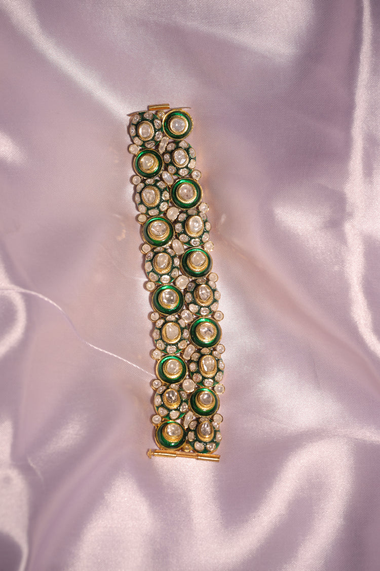 An exquisite blend of traditional charm and modern versatility. This piece features intricate green enamel work paired with brilliant uncut stones and delicate gold detailing. Whether worn around the neck as a striking choker or wrapped around the wrist as a bold cuff bracelet, it adds a regal touch to any look.