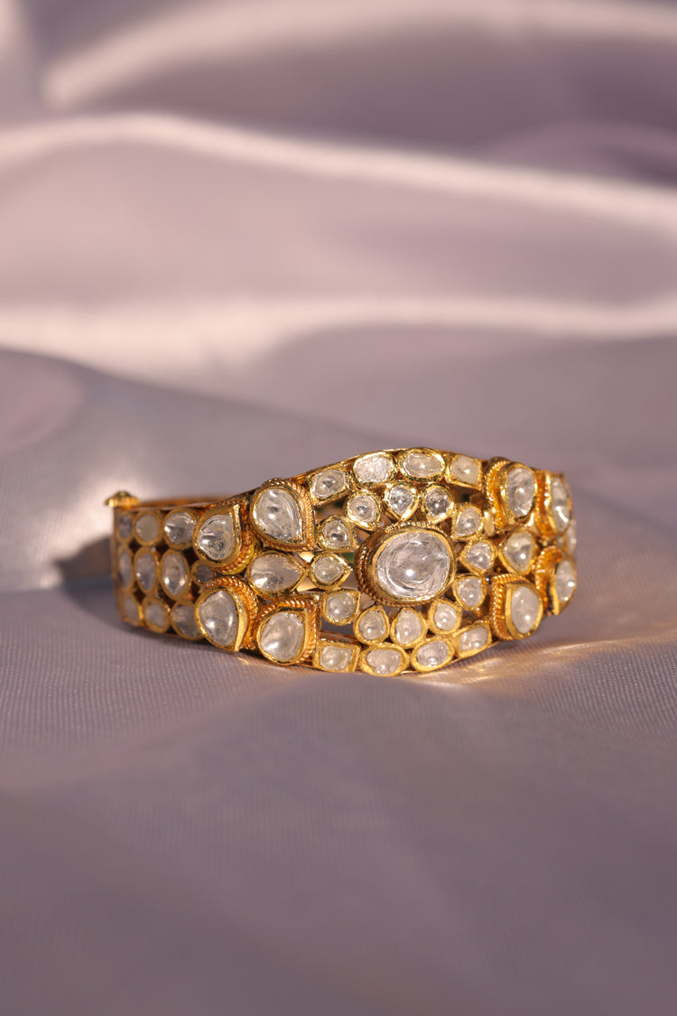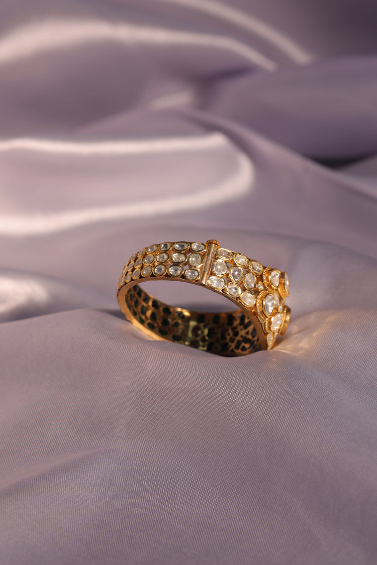 Crafted in 18K gold, the Regal Polki Cuff Bangle features an array of uncut Polki diamonds set in a traditional Indian style. The broad, cuff-like design is densely encrusted with diamonds of varying sizes, ensuring maximum sparkle and a stunning visual impact. The intricate gold setting provides a luxurious backdrop, highlighting the antique charm of the Polki diamonds.