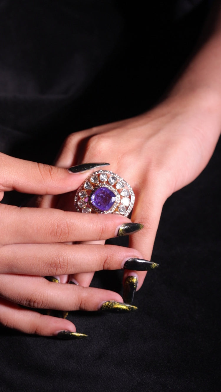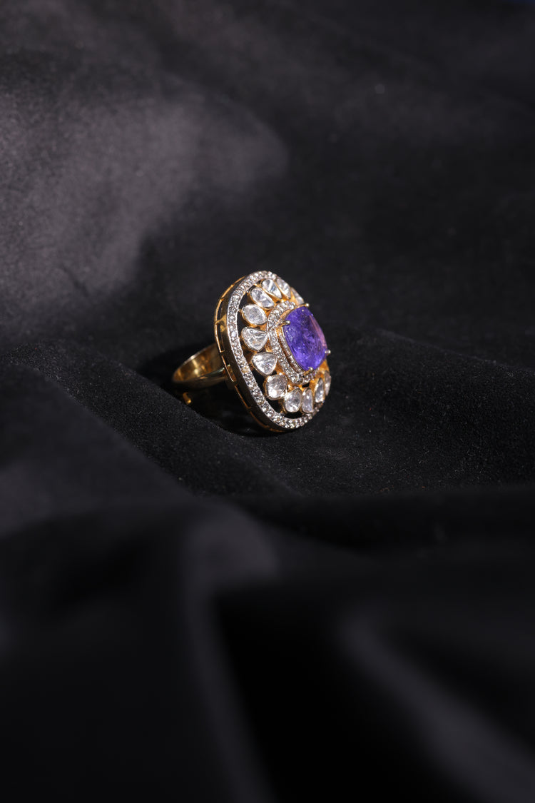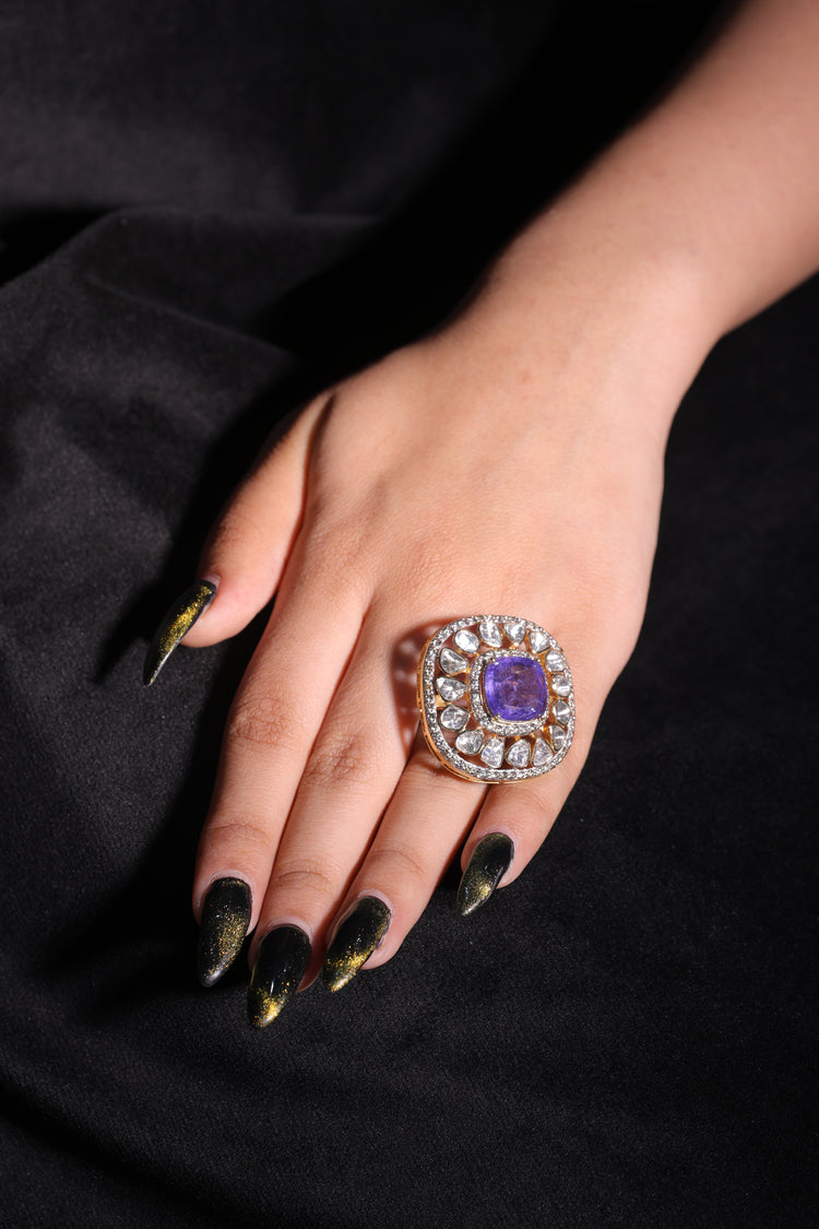 Crafted in 14-carat white gold, the Celeste Tanzanite Halo Ring features a stunning cushion-cut tanzanite gemstone encircled by a radiant halo of finely set diamonds. A statement piece that exudes luxury and refined elegance.