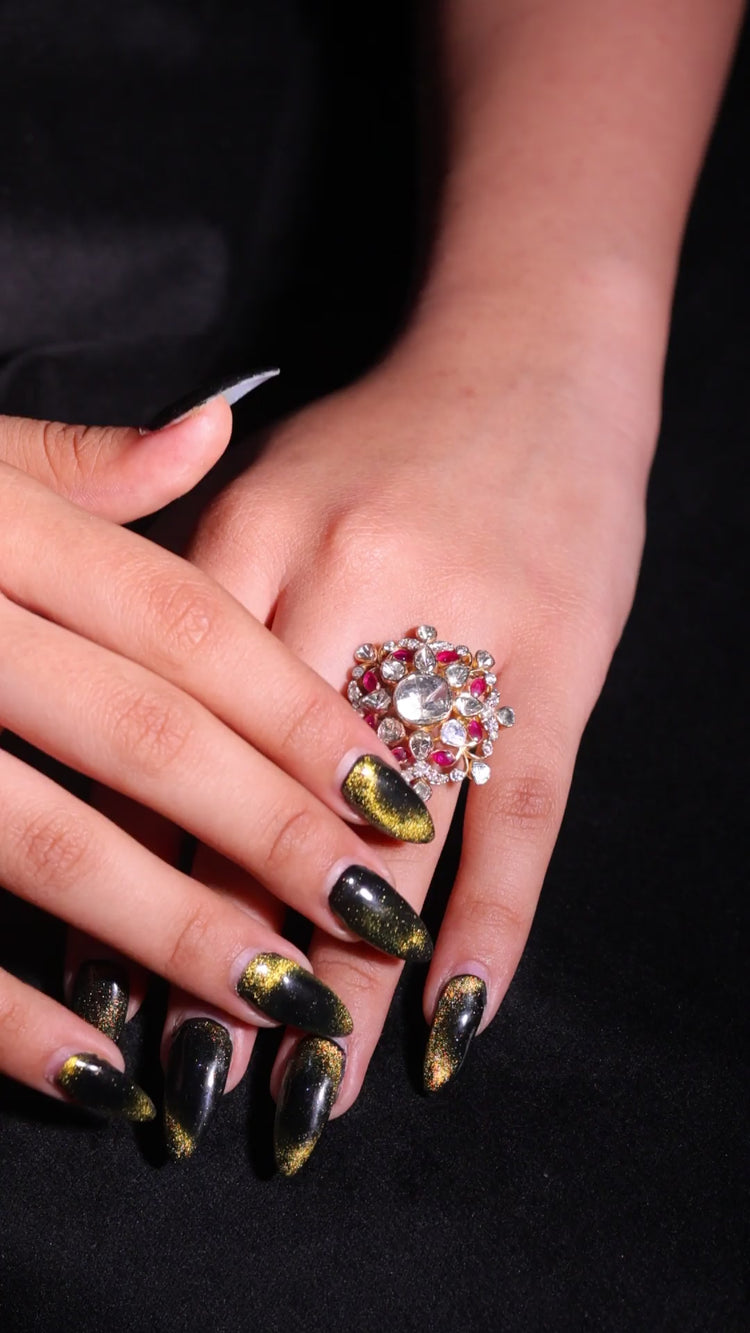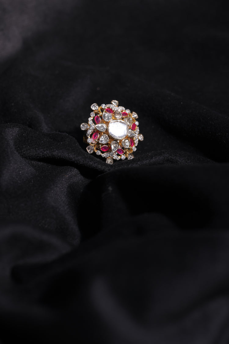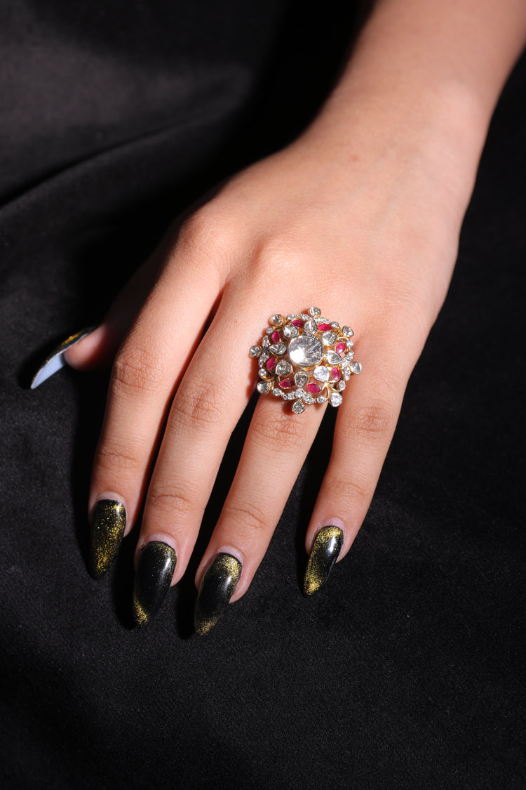 Crafted in 14-carat gold, the Gulzar Polki Bloom Ring features a floral design centered around a large uncut Polki diamond, encircled by smaller diamonds and rich red gemstones. The piece reflects the timeless elegance of traditional Indian craftsmanship.