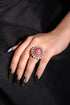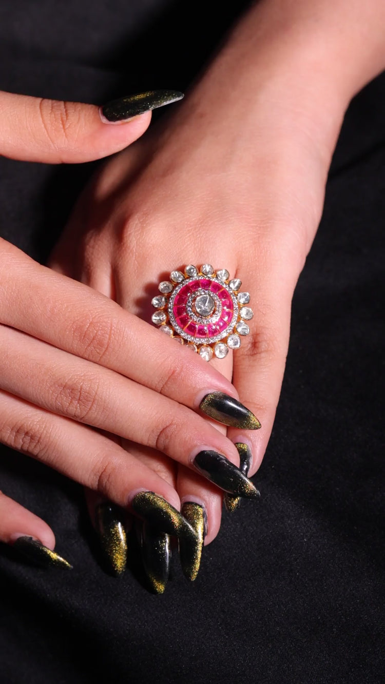At its center lies a prominent clear stone, encircled by a halo of rich red stones. The outer edge is adorned with a layer of smaller clear stones, enhancing the overall brilliance and adding a refined touch. Crafted with a 14K gold finish over silver, this ring seamlessly blends classic charm with everyday versatility.