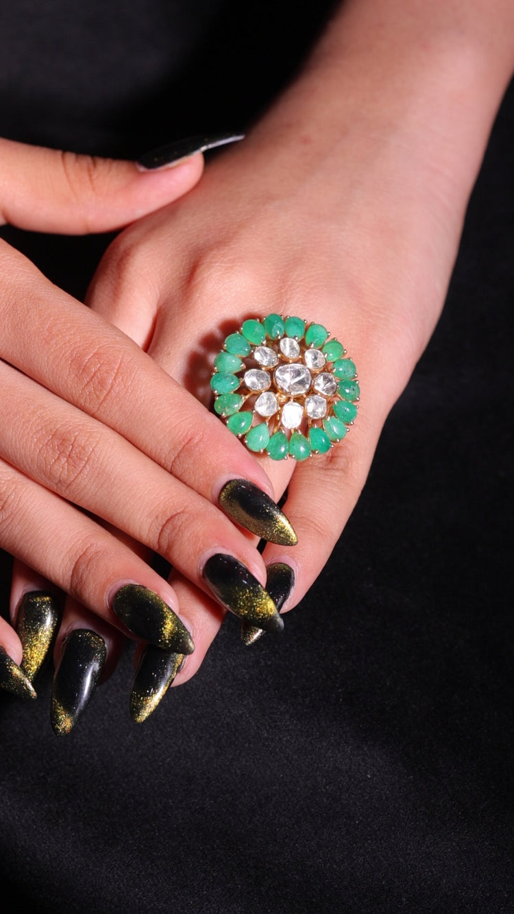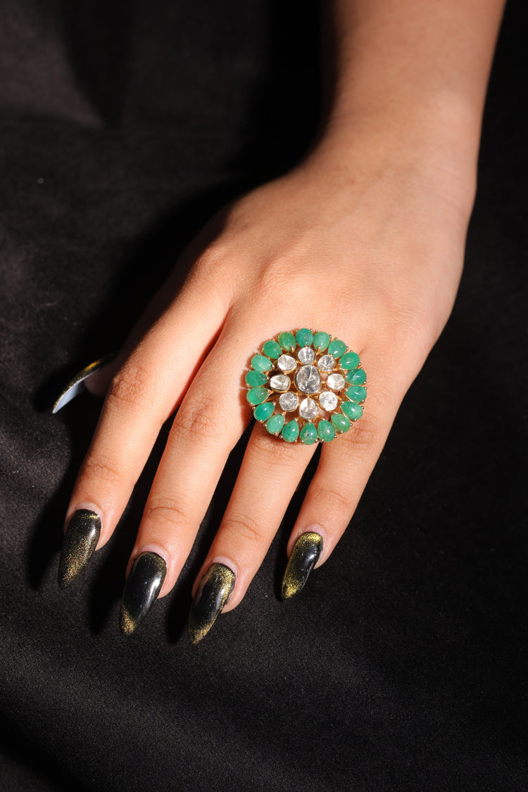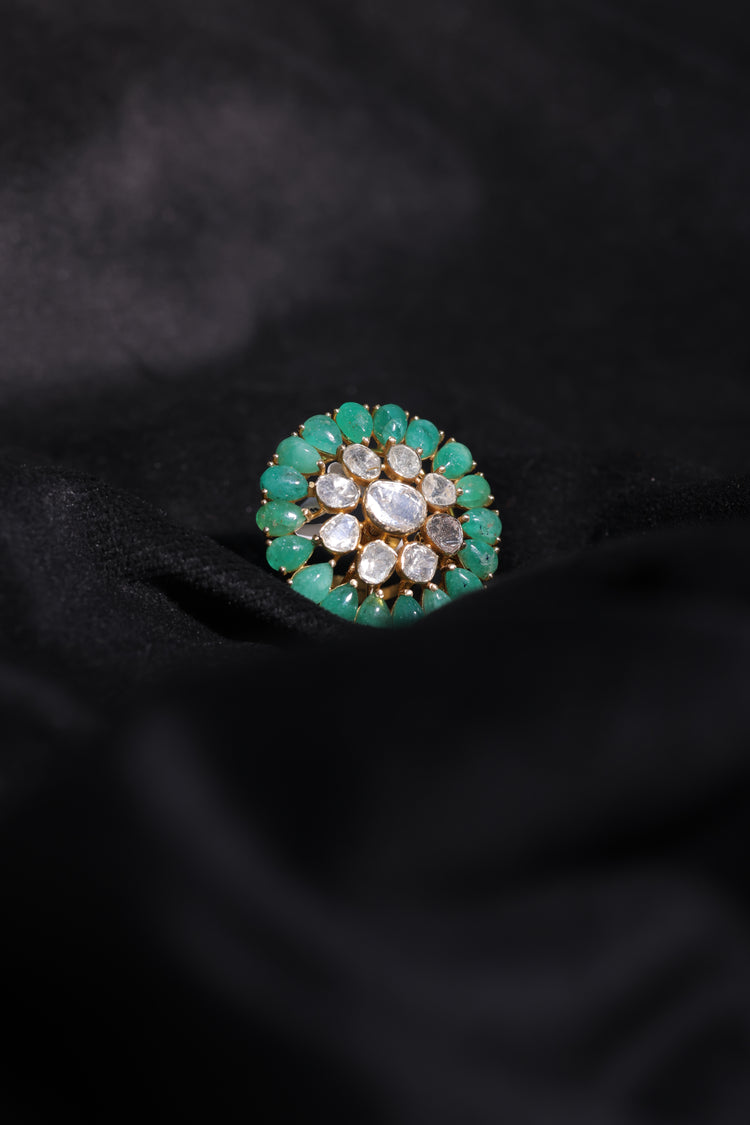 Crafted in 18-carat gold, the Emerald Polki Blossom Ring features a captivating cluster of Polki diamonds at its center, encircled by vibrant emerald gemstones. A beautiful fusion of elegance and tradition, this ring adds a regal touch to any occasion.