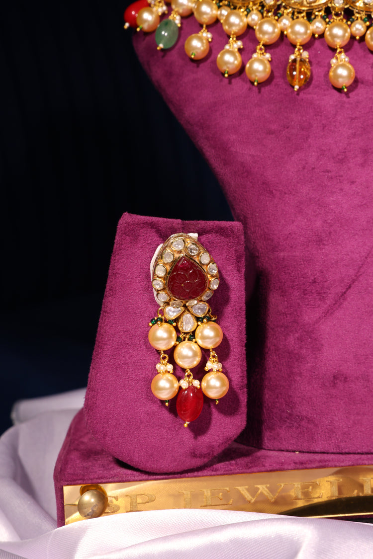 The Aira Layered Pearl Set captures the elegance of traditional Indian design with refined detail and balance. Crafted in 18K gold, the necklace features a graceful layered arrangement with a central row of prominent stones, bordered by delicate polkis. The matching earrings echo the same rich combination, offering a cohesive and luxurious finish.