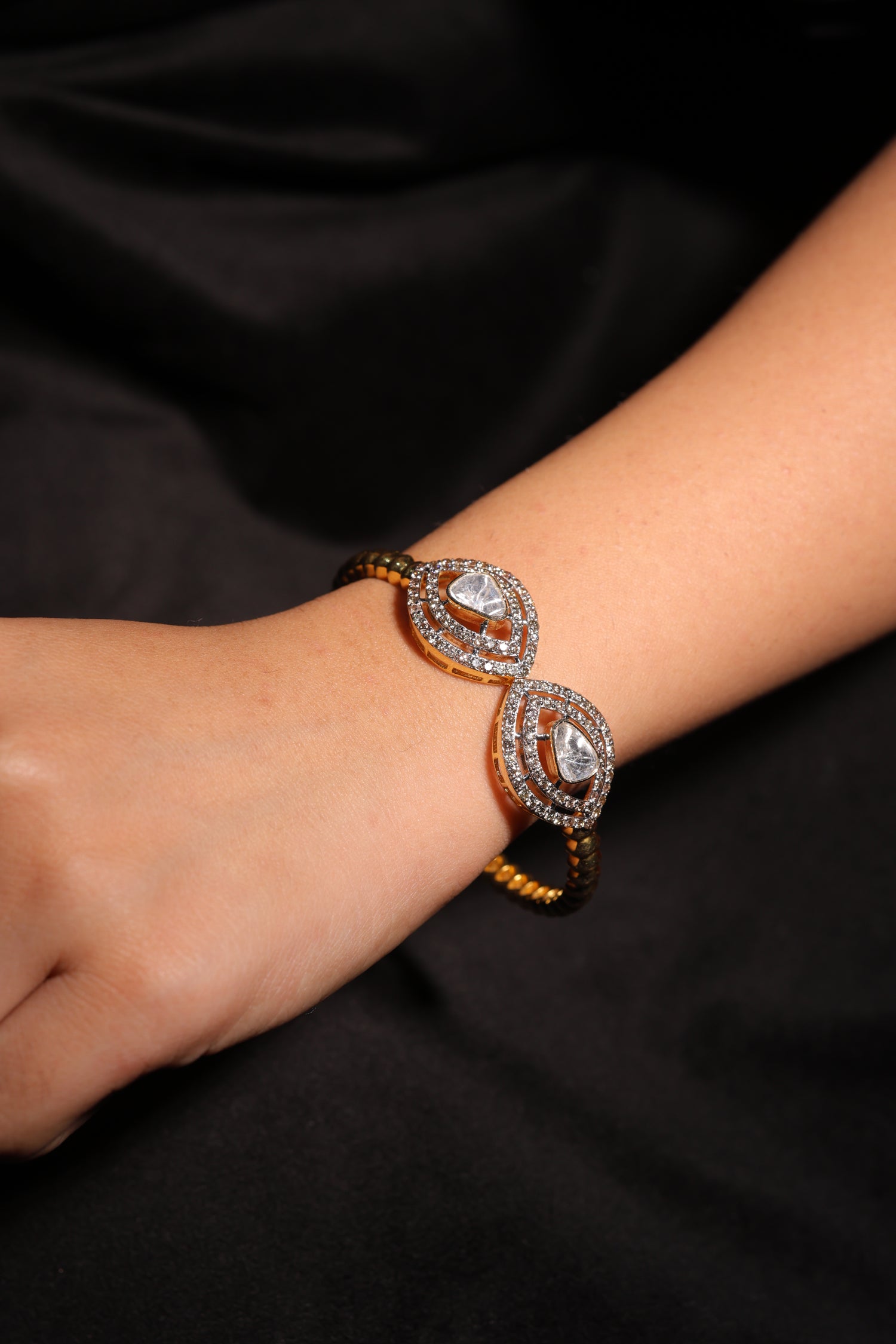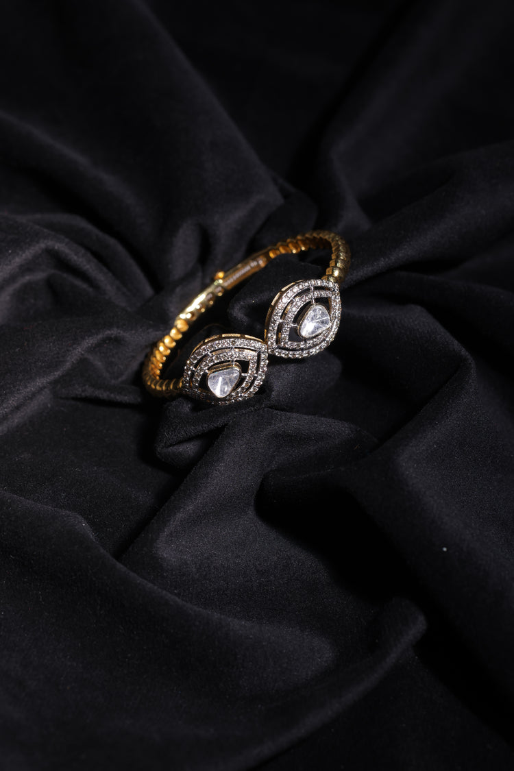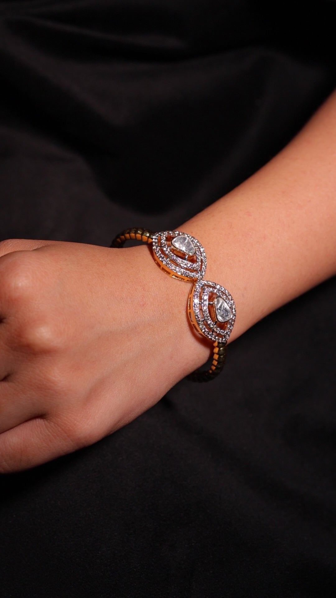 Crafted in 14K gold, the Antique Leaf Polki Bangle Bracelet showcases a timeless design rooted in traditional Indian craftsmanship. It features two prominent leaf-shaped settings, each encrusted with small, uncut Polki diamonds that radiate raw, natural brilliance. The textured gold band mimics a woven or beaded finish, enhancing its antique charm and artisanal detail. This bracelet blends heritage with elegance, making it an ideal piece for collectors and connoisseurs of traditional jewelry.