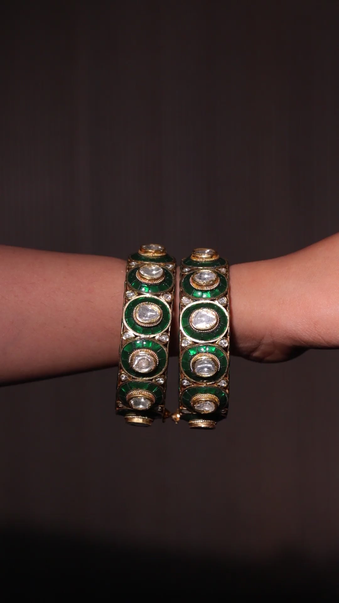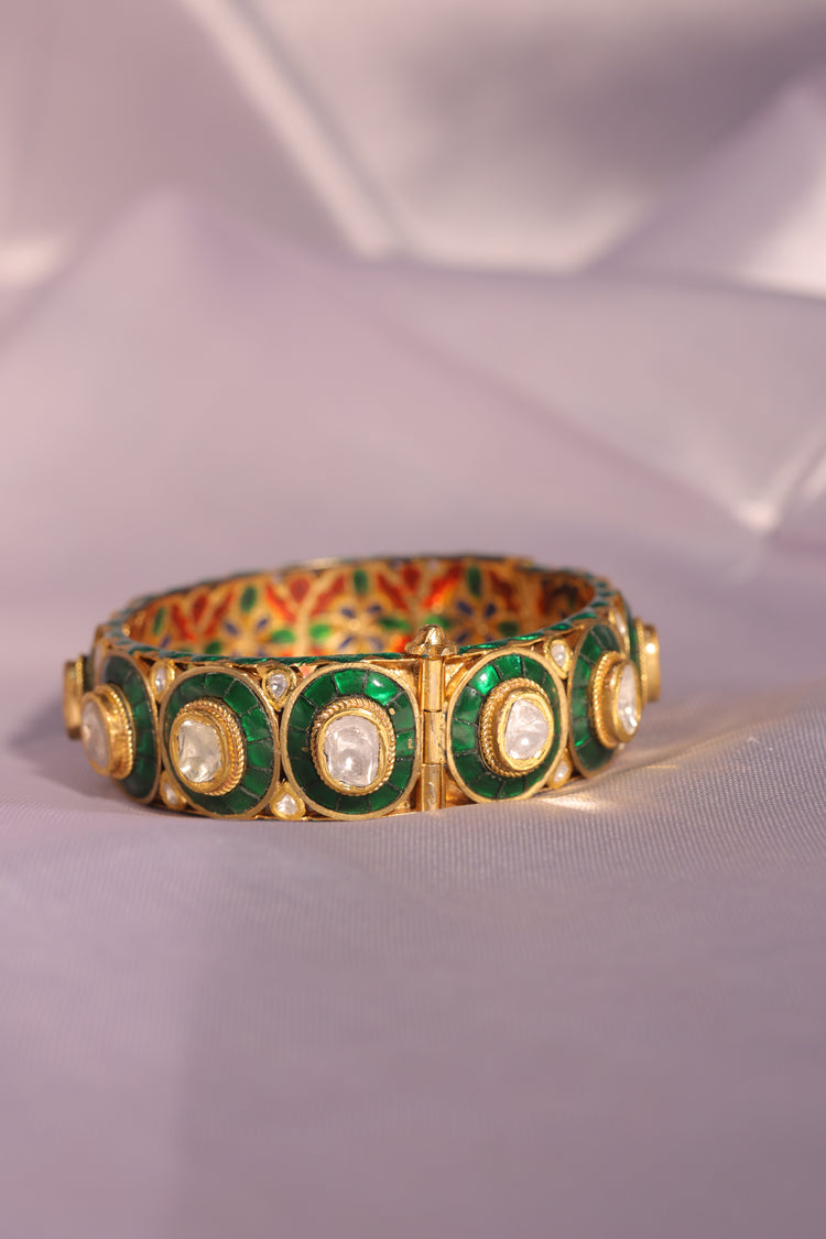 Crafted with 18K gold, The outer surface is adorned with vibrant green Meenakari enamel work, enhancing the overall opulence and cultural richness of the piece. Ideal for festive and ceremonial wear, these bangles reflect timeless elegance rooted in Indian heritage.