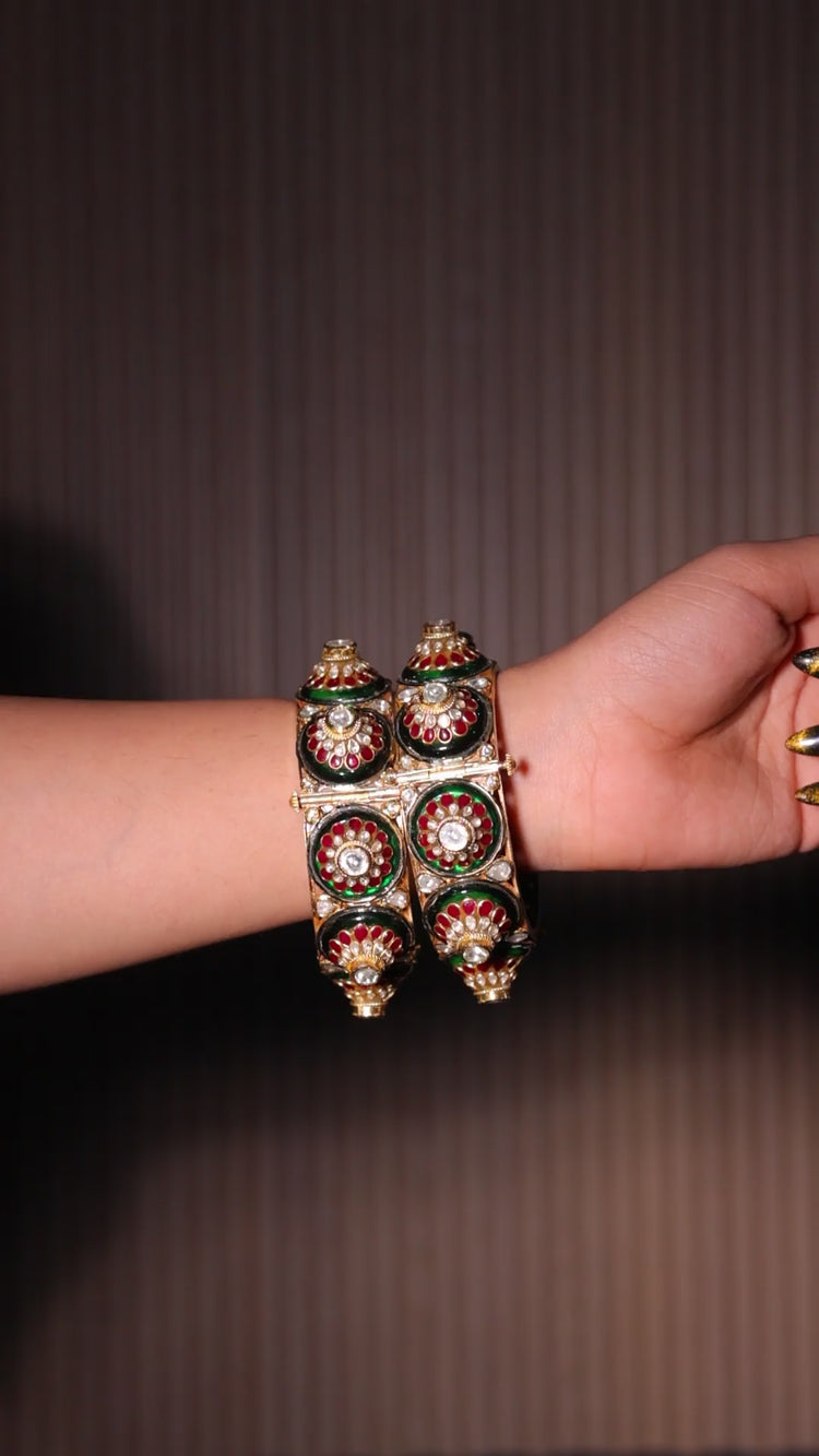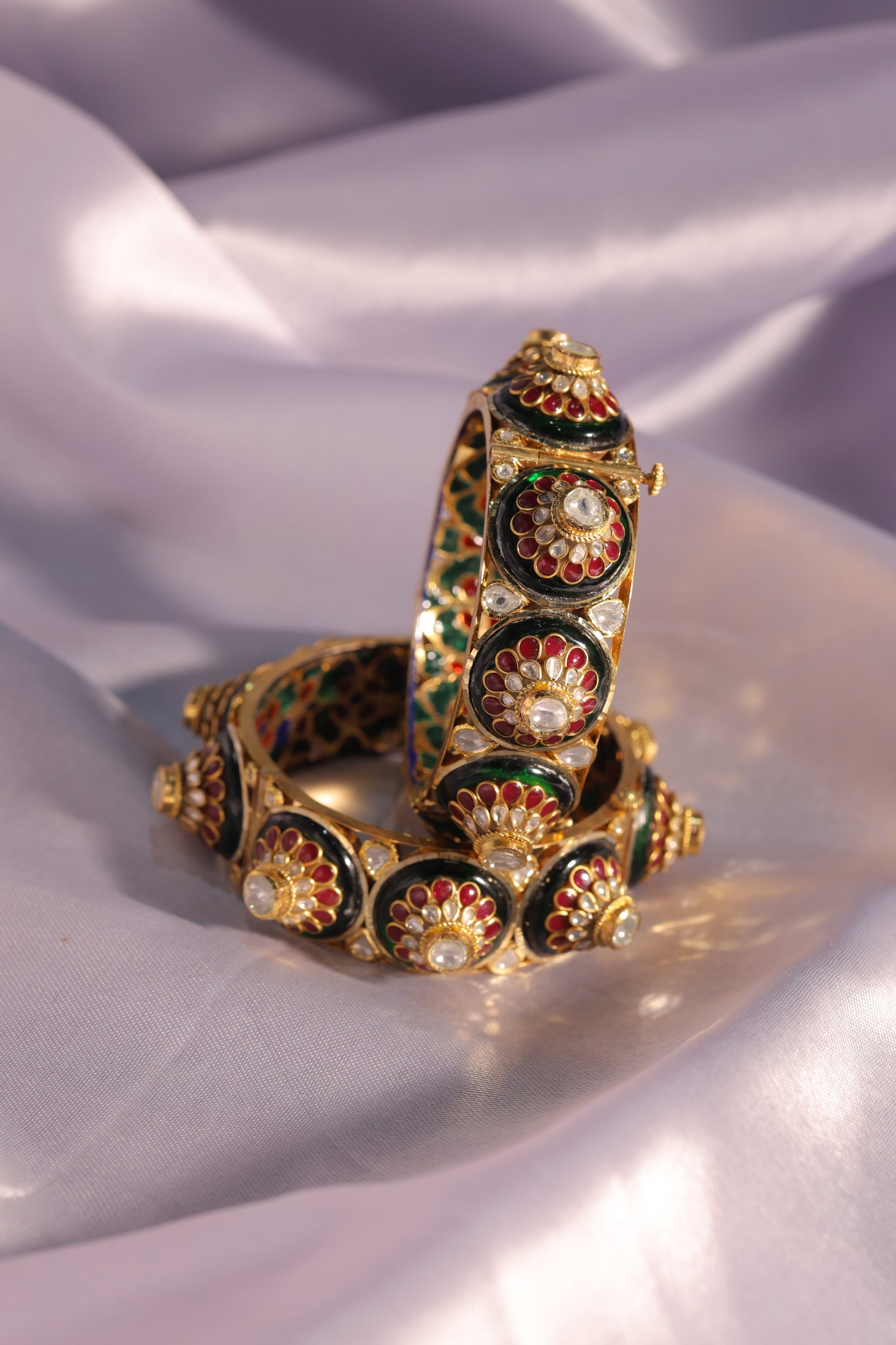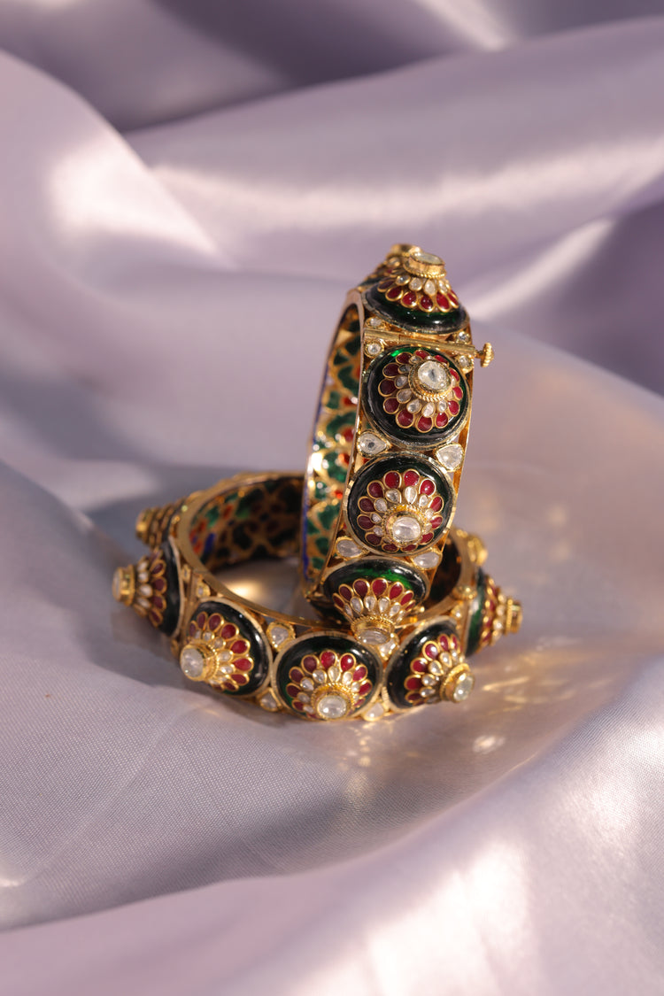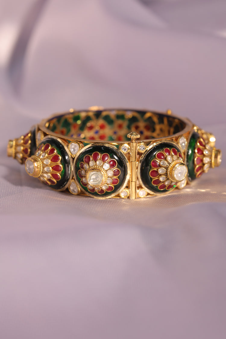 Crafted in 18K gold, the Meenakari Floral Bangle features small, brilliant-cut polki set in a beautiful floral pattern. Adorned with red, green, and blue enamel work (meenakari) and possibly Polki diamonds, the intricate design continues on the inner part of the bangle. It also includes a convenient screw or hinge mechanism for easy wear.