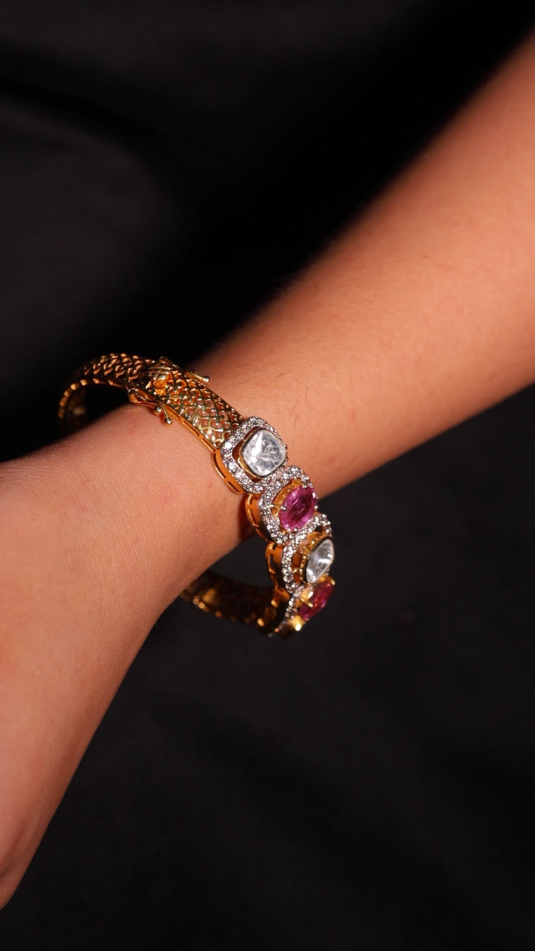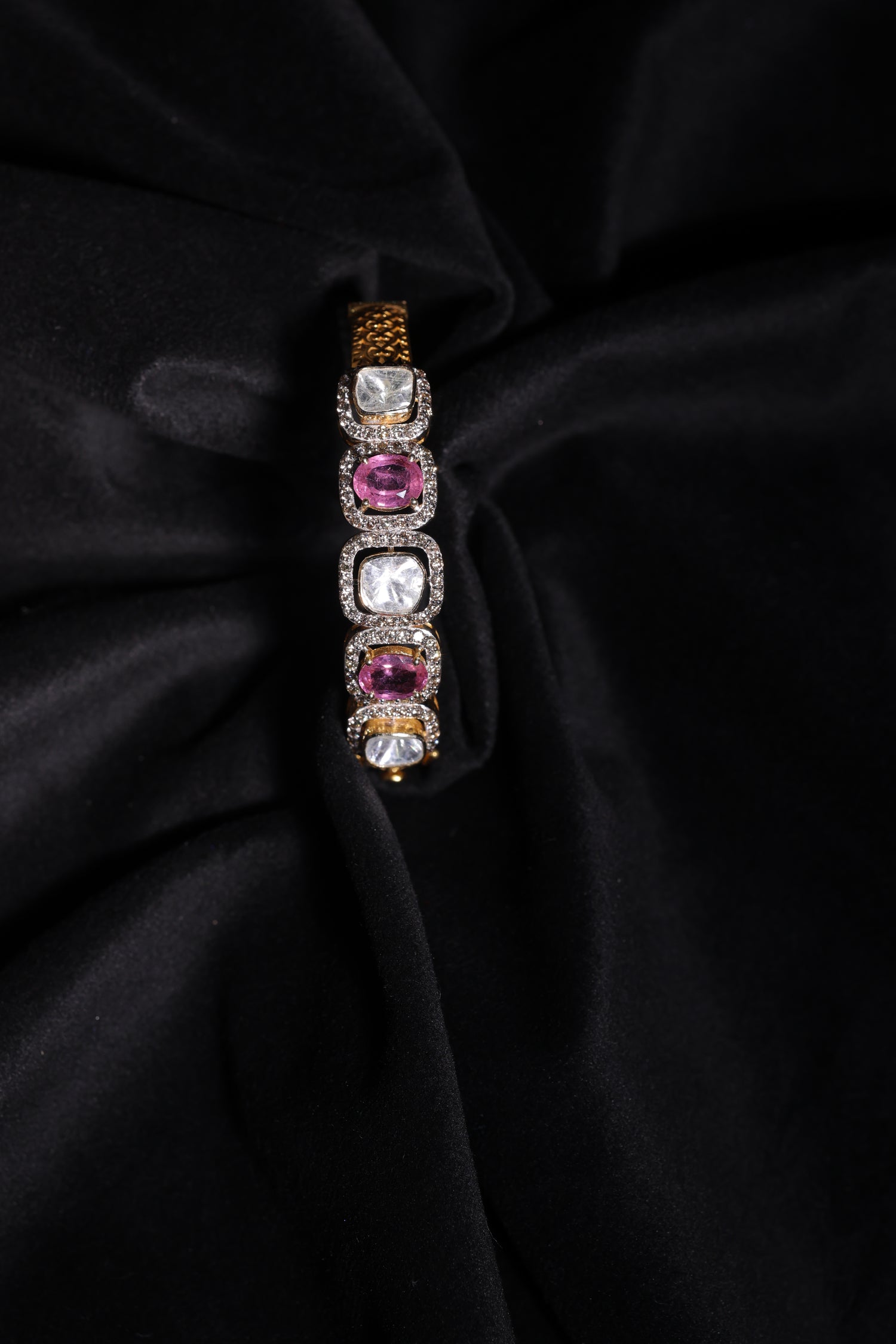 Crafted in 14K gold, the Rosé Gleam Bracelet showcases a refined design featuring five prominent cushion-cut stones in an alternating pattern of soft pink and clear hues. Each center stone is bezel-set and bordered by smaller shimmering clear stones, enhancing their brilliance. The band features an intricately textured or woven finish, giving the bracelet an elegant and artisanal touch. Ideal for both traditional and contemporary occasions, this bracelet exudes grace and sophistication.