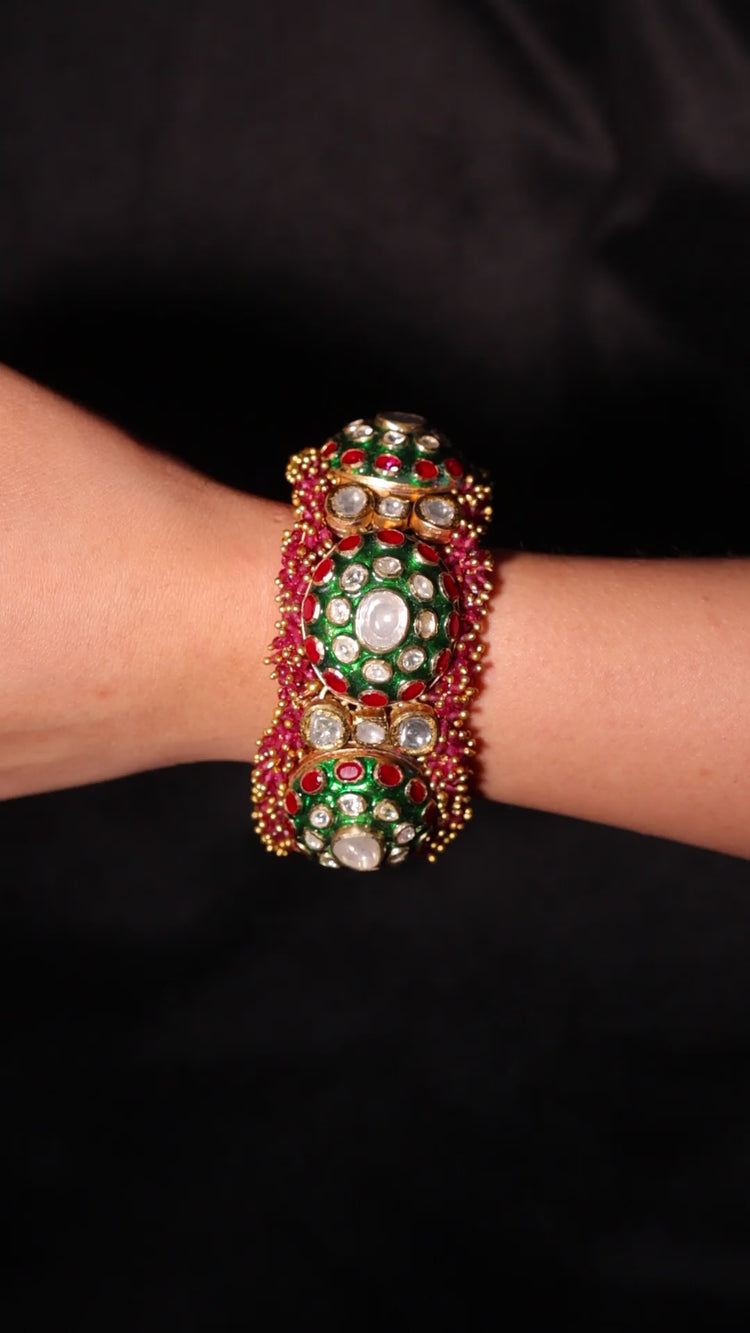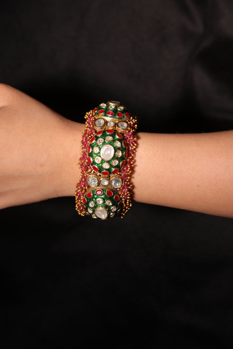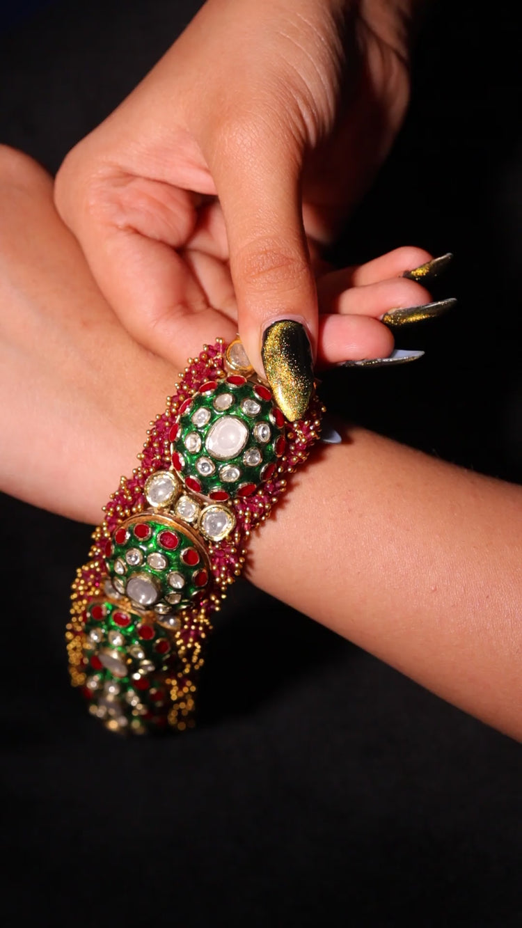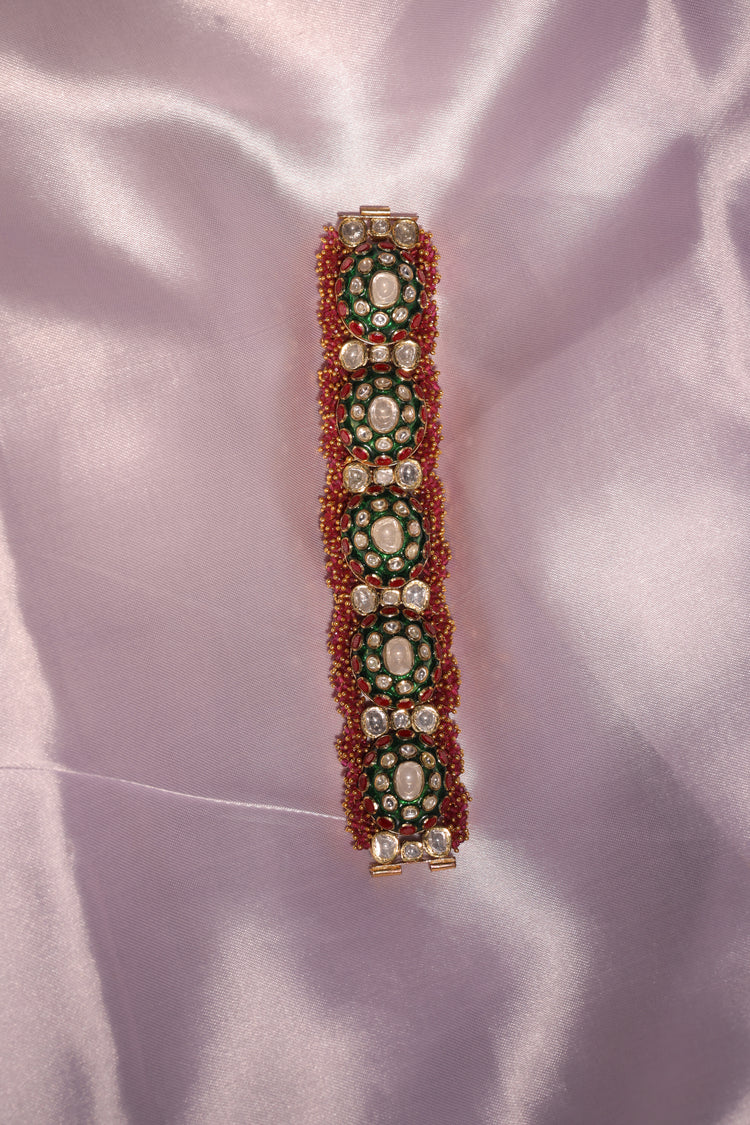 This Pacheli bracelet is a traditional Indian masterpiece, showcasing intricate vibrant Meenakari work, and elegant pearls. The design is enriched with red and green stones arranged in floral motifs, combined with detailed Meenakari accents that enhance its ethnic charm. Perfect for weddings, festive occasions, and cultural celebrations, this bracelet reflects a royal and timeless aesthetic rooted in Indian heritage.