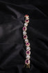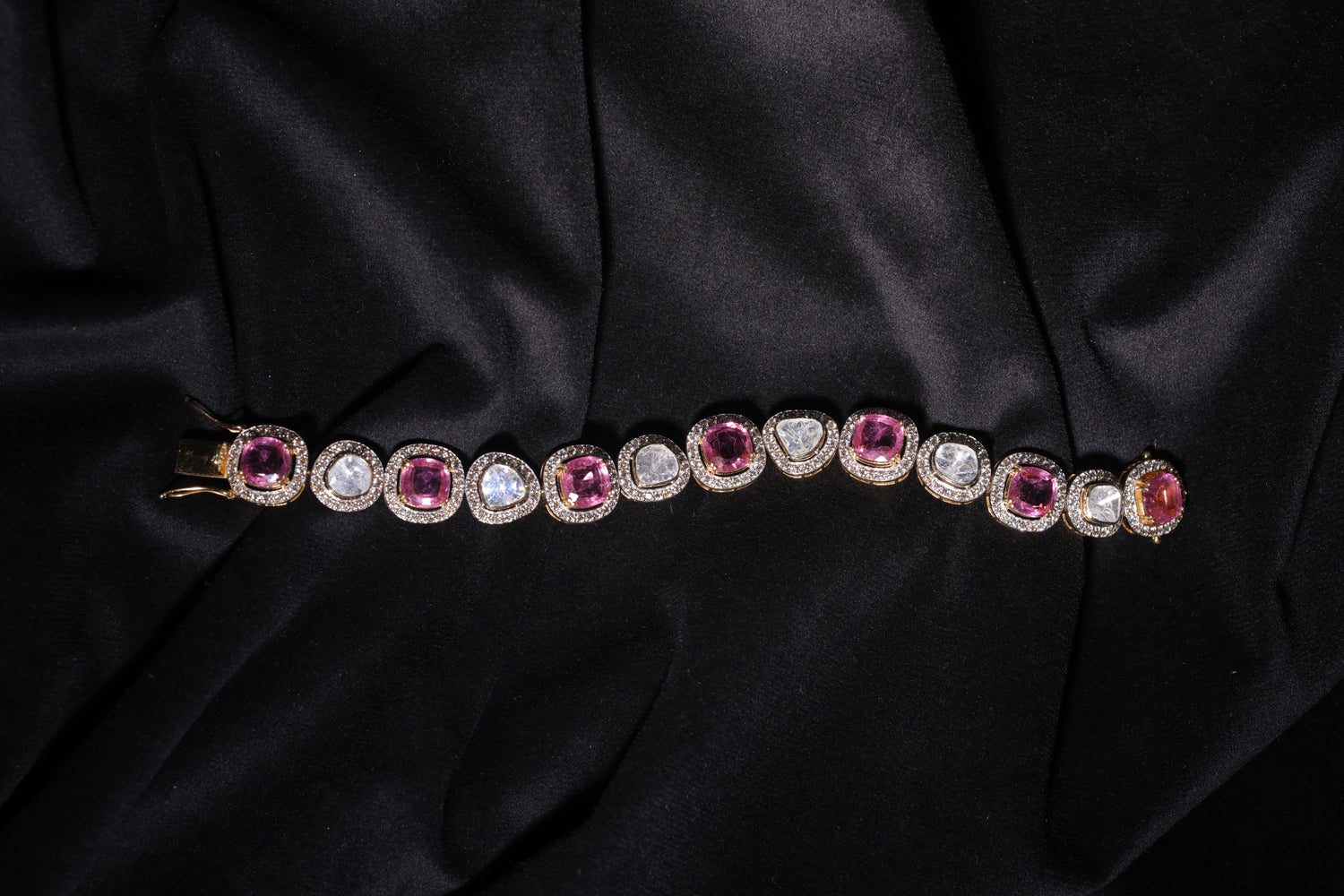Crafted in 14K gold, the Ruby Radiance Bracelet features an elegant alternating pattern of cushion-cut pink gemstones and clear stones, each encircled by a halo of shimmering clear stones. The pink gemstones, resembling rubies, and the clear stones are securely set in prong or bezel settings, creating a continuous sequence of brilliance along the bracelet. The classic hook-and-eye closure ensures a secure fit, making this piece both timeless and versatile for any occasion.